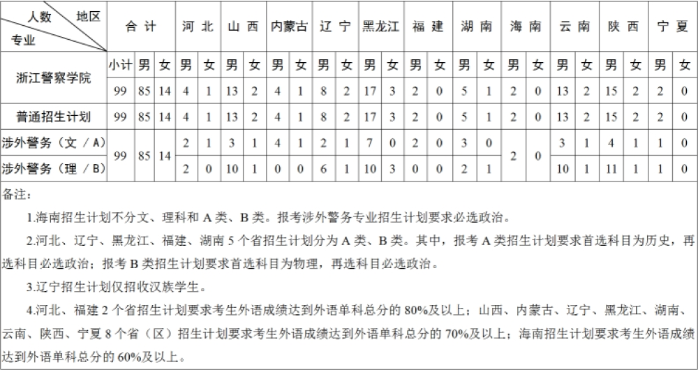 浙江警察学院2024年全国各省分专业招生计划