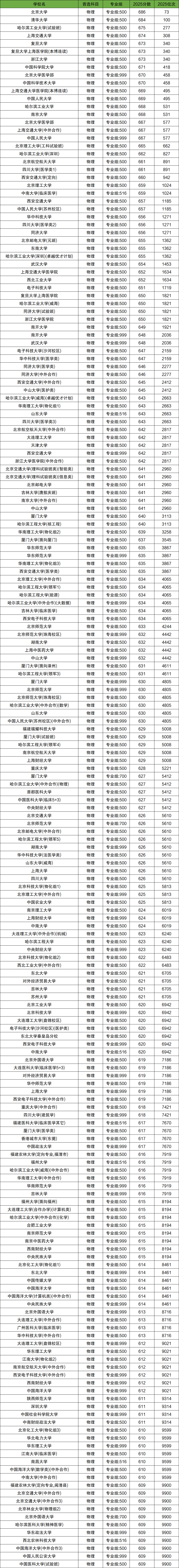 了解各大学在福建招生录取位次很重要,根据福建省2025年全国大学录取分数线可知,在1万名之前的物理类考生能上的学校有167所,其中分数最高的有北京大学、清华大学、哈尔滨工业大学(试验班)、上海交通大学、复旦大学等。