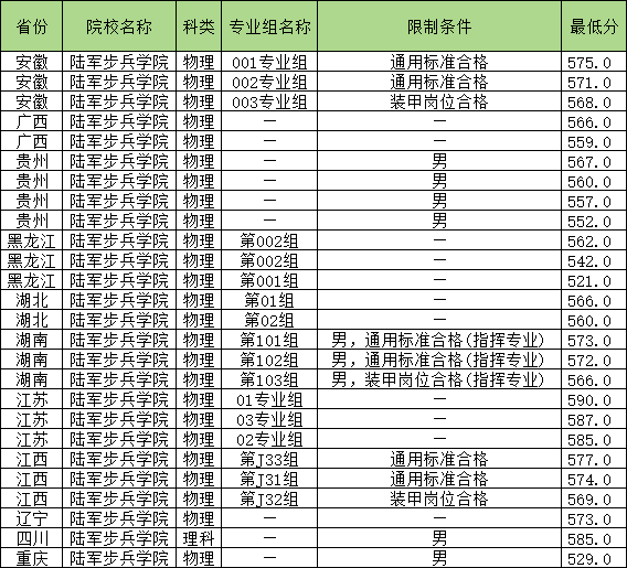 | 陆军步兵学院 | 物理 | 002专业组 | 特种作战岗位合格 | 579 |