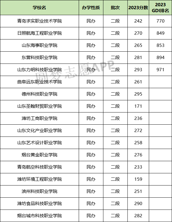 二、山东民办专科院校排名及分数线