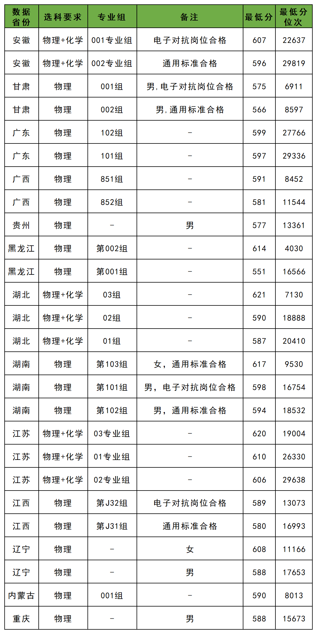 再比如在北京,空军预警学院录取最低分是545分,但这只是在选考物理和化学科目中男生的最低分,如果是选考物理和化学的女生,最低分则可达576分。