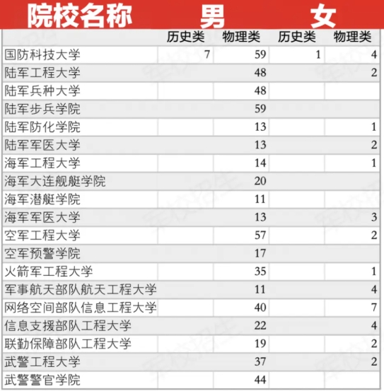 1、国防科技大学:历史类男生7人、女生1人,物理类男生59人、女生4人
