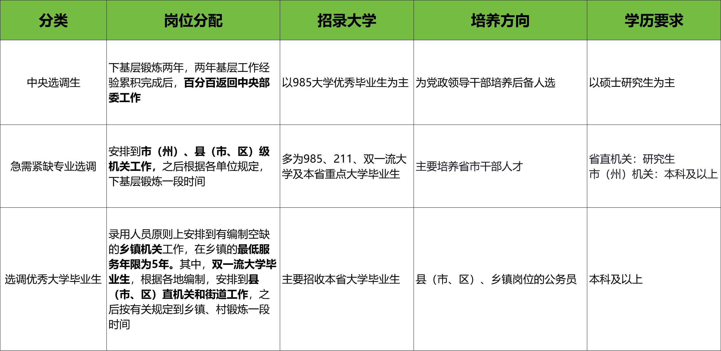 从应聘难度、发展前景看:中央选调>急需紧缺专业选调>选调优秀大学毕业生。三者的区别如下: