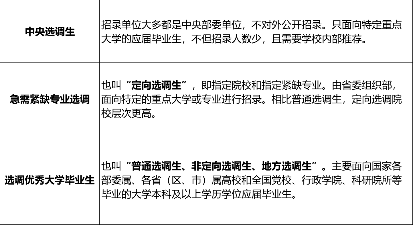 选调生分为3种类型:中央选调生、急需紧缺专业选调生、选调优秀大学毕业生。