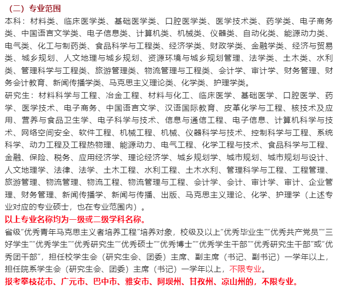 ②部分大学明确规定:报考攀枝花市、广元市、巴中市、雅安市、阿坝州、甘孜州、凉山州的选调生时,不限专业。