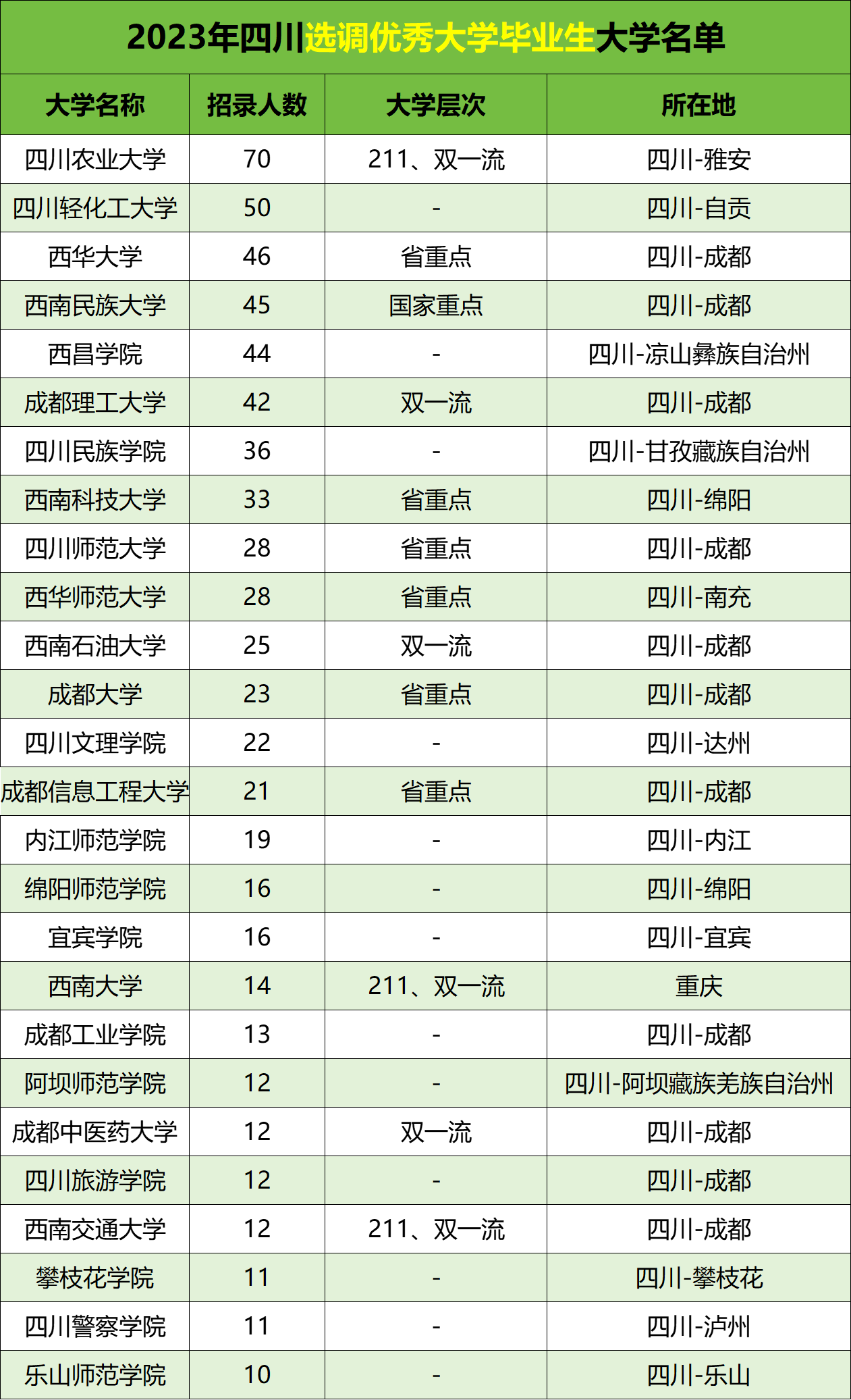 圆梦志愿为高考生整理了:四川省选调优秀大学毕业生2023年招录人数在10人以上的大学。具体名单如下↓
