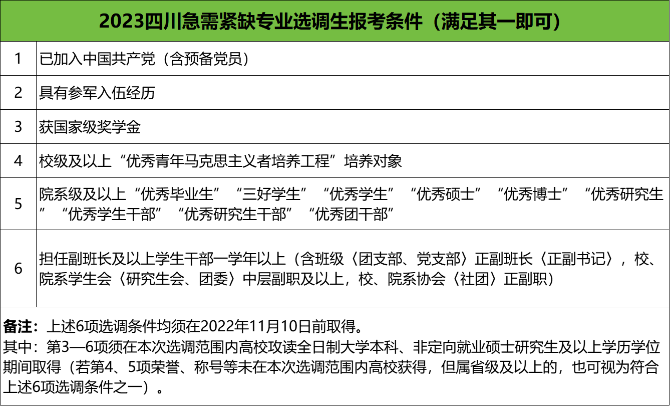 ①清华大学、北京大学、中国人民大学、上海交通大学、复旦大学、同济大学、南开大学、浙江大学、西安交通大学、南京大学、中国科学院大学、哈尔滨工业大学这12所大学的毕业生,报考四川急需紧缺专业选调生时,不限制专业,任何专业都可以报名。