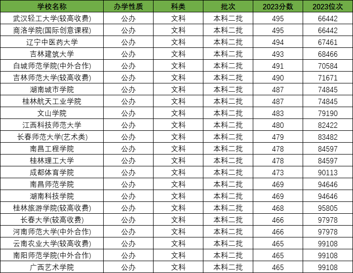 2023年河南文科本科二批录取控制分数线为465分,超本科线30分也就是在465分-495分之间的录取大学。