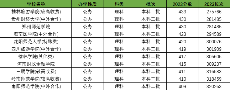 在河南理科超本科线30分录取的公办二本大学比文科录取的要少一些,录取的学校共有12所。这些在理科本科二批录取的大学中,有不少是中外合作专业和较高收费专业,以普通类本科专业招生的大学仅有2所,分别是郑州师范学院(430分)和河南财政金融学院(415分)。