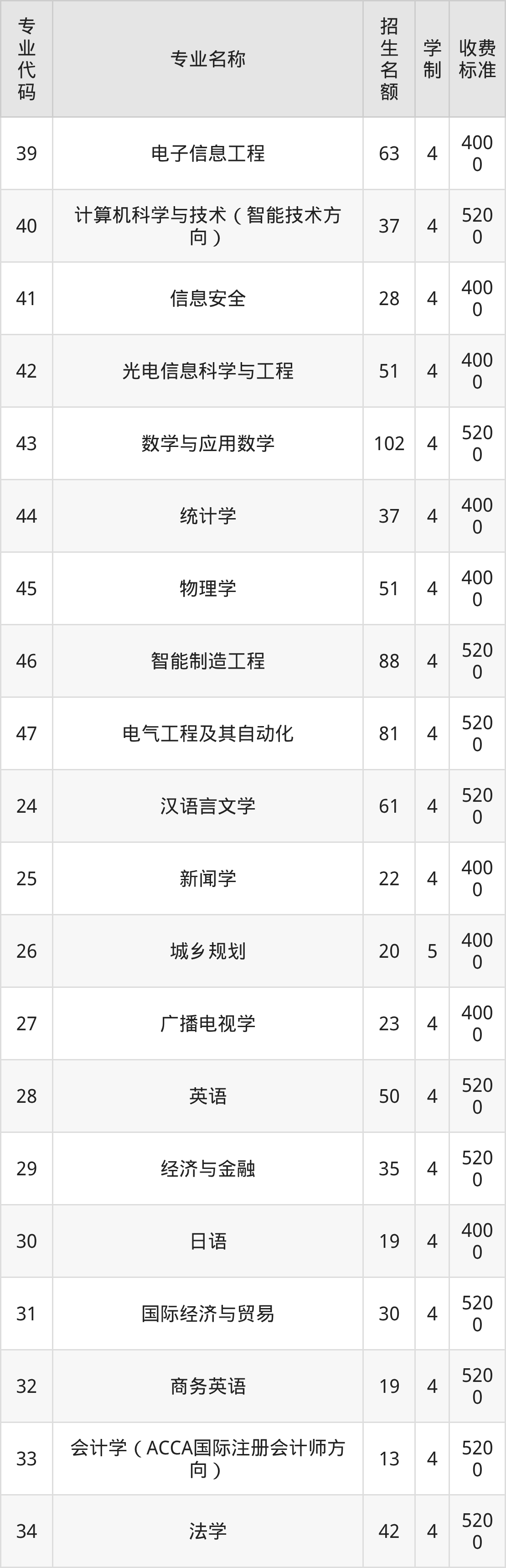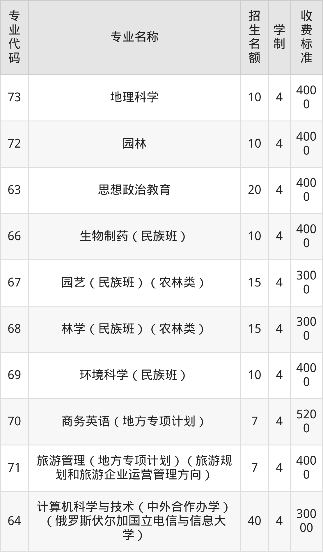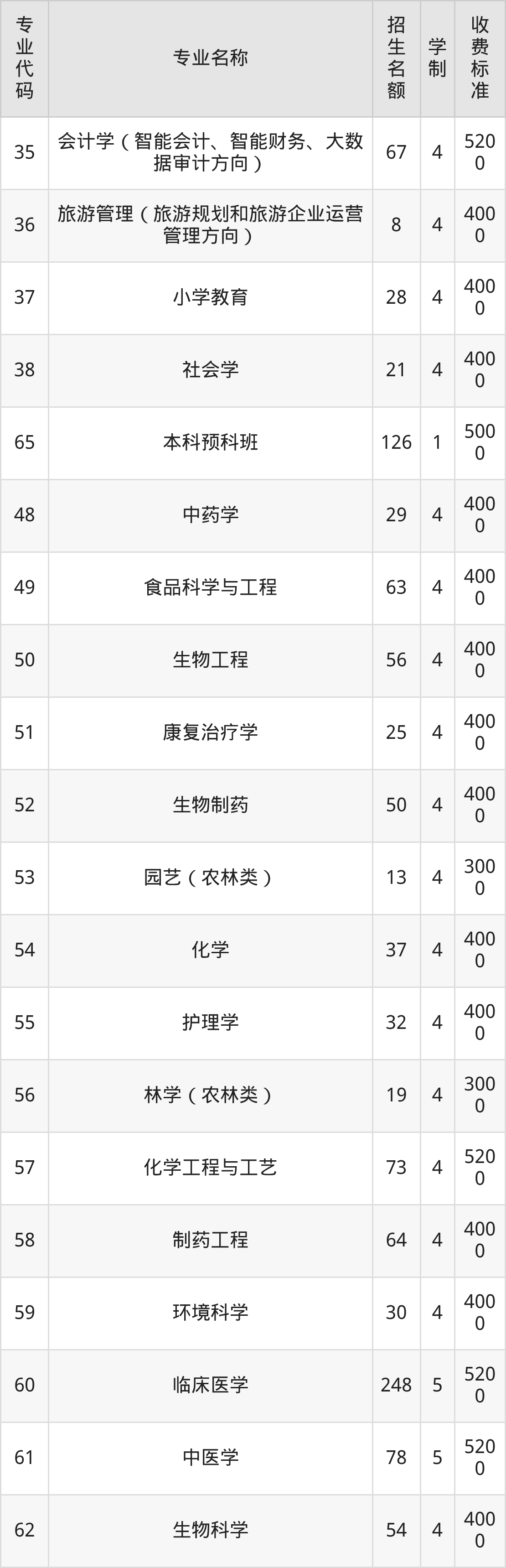 | 专业 代码 | 专业名称 | 招生 名额 | 学 制 | 收费 标准 |