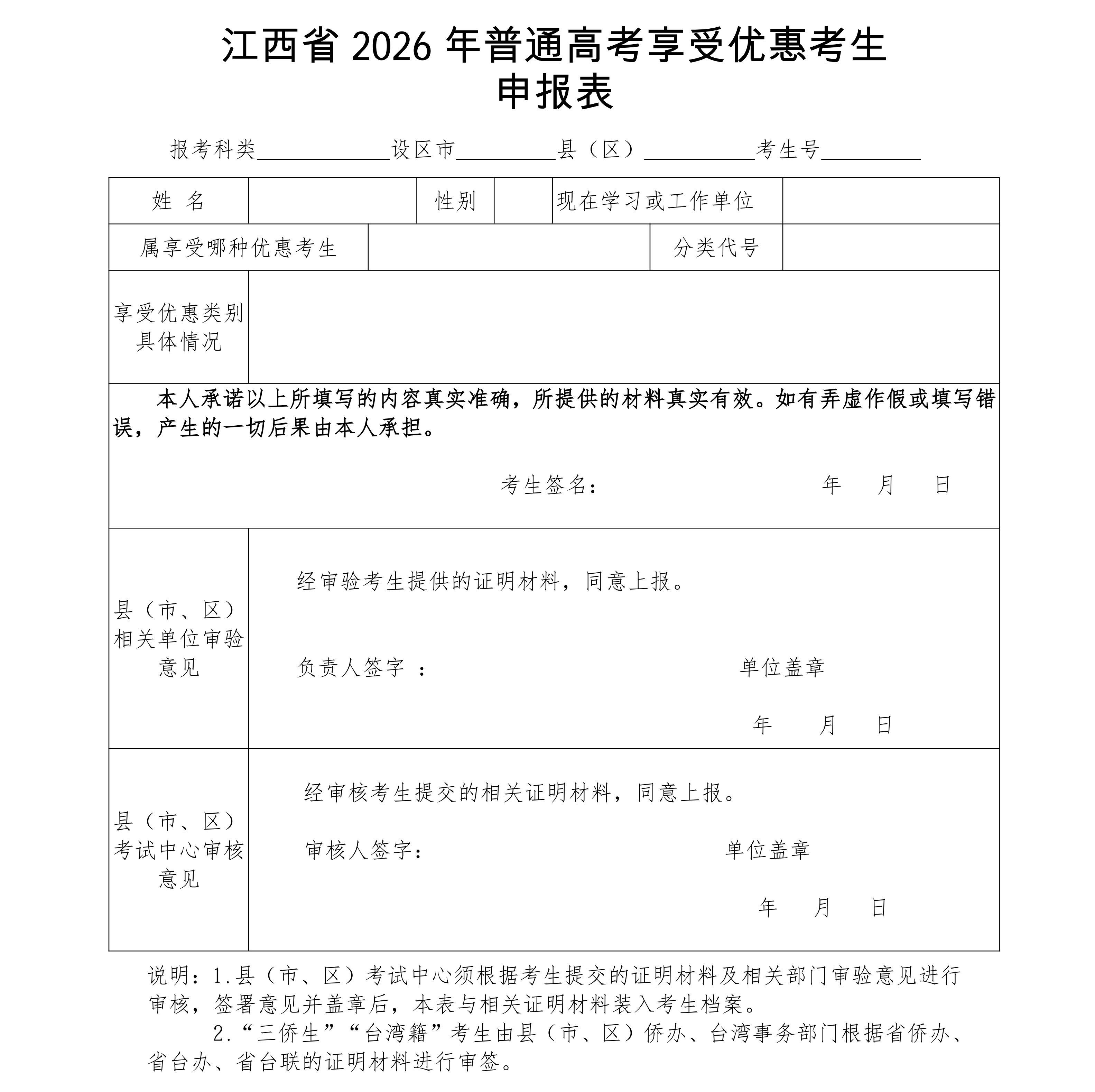考生在网上下载打印或到县(市、区)教育考试中心领取《江西省2026年普通高校招生享受优惠考生申报表》,按照要求填写并由考生本人签名承诺所填写内容的真实性。