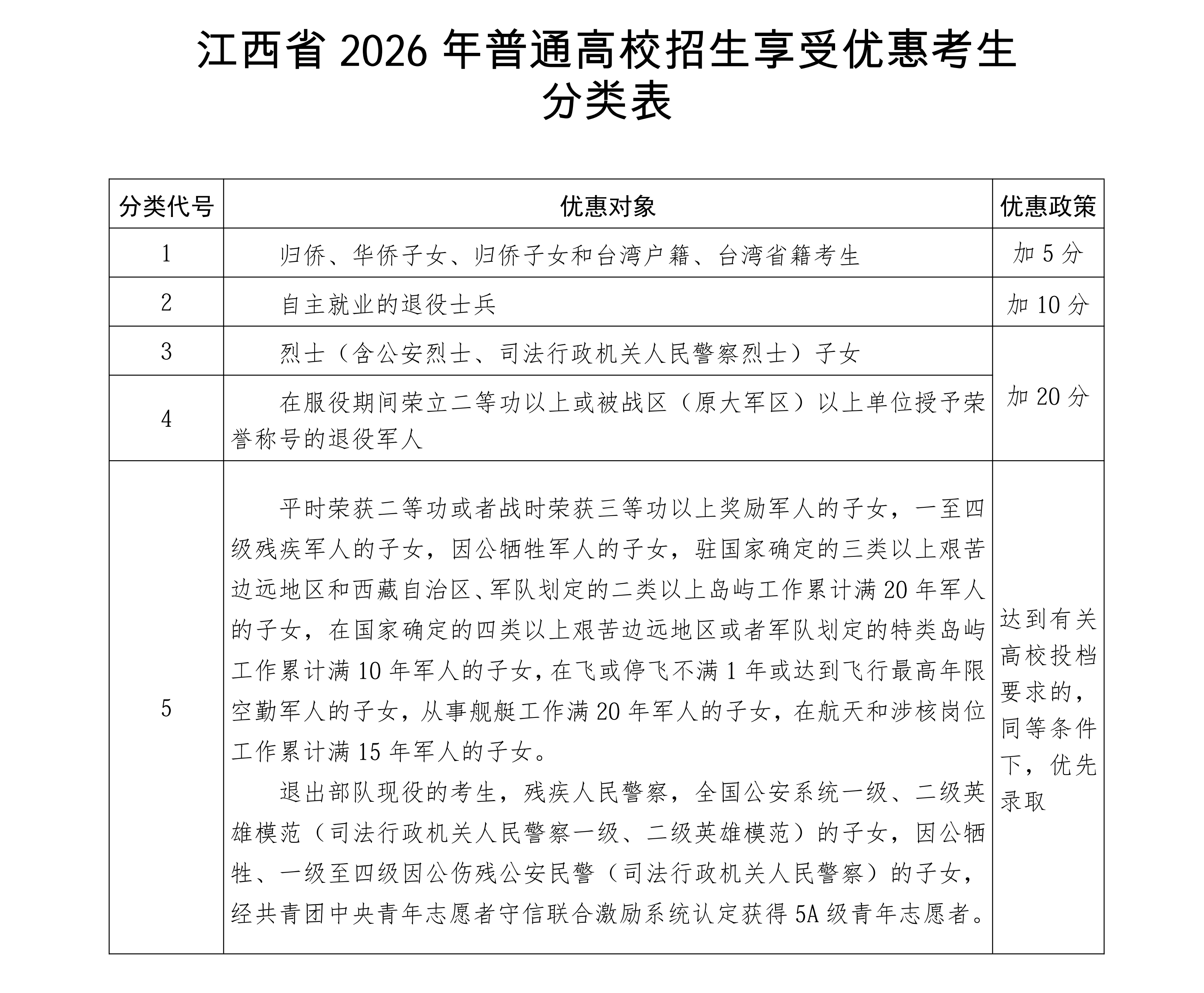 2026年江西高考加分优惠政策涉及烈士子女、退役军人、退役士兵、三侨一台,高考加分分值依次为20分、20分、10分、5分。