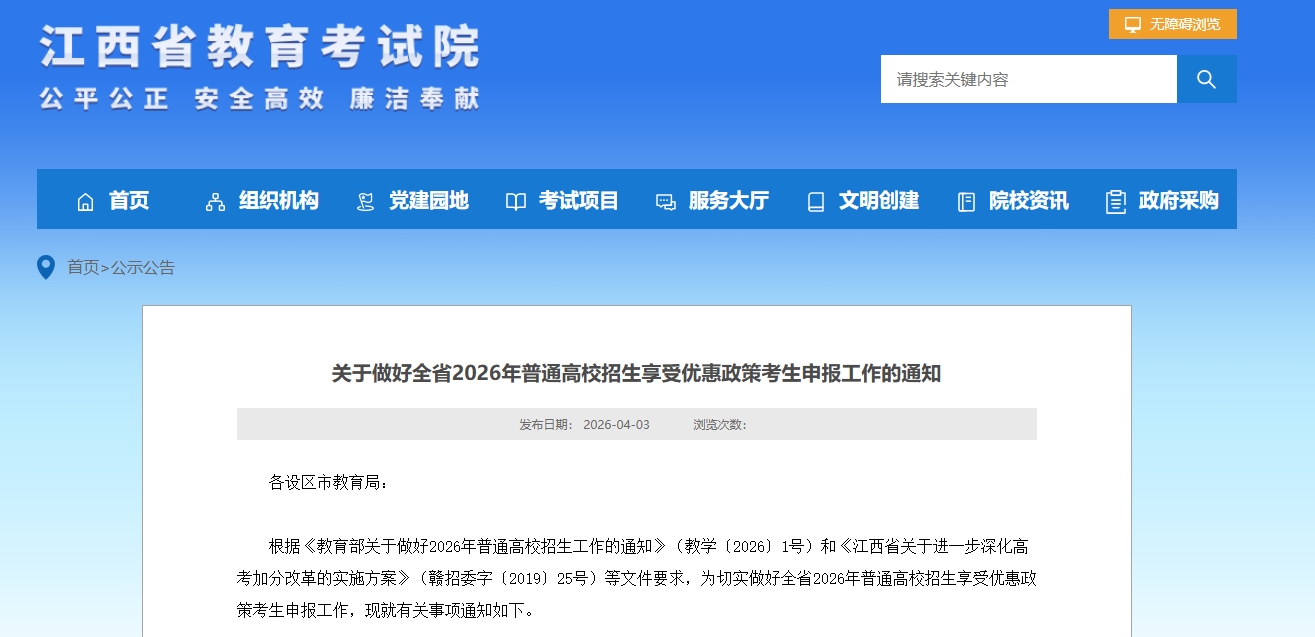 2026年4月3日,江西省教育考试院发布《关于做好全省2026年普通高校招生享受优惠政策考生申报工作的通知》。