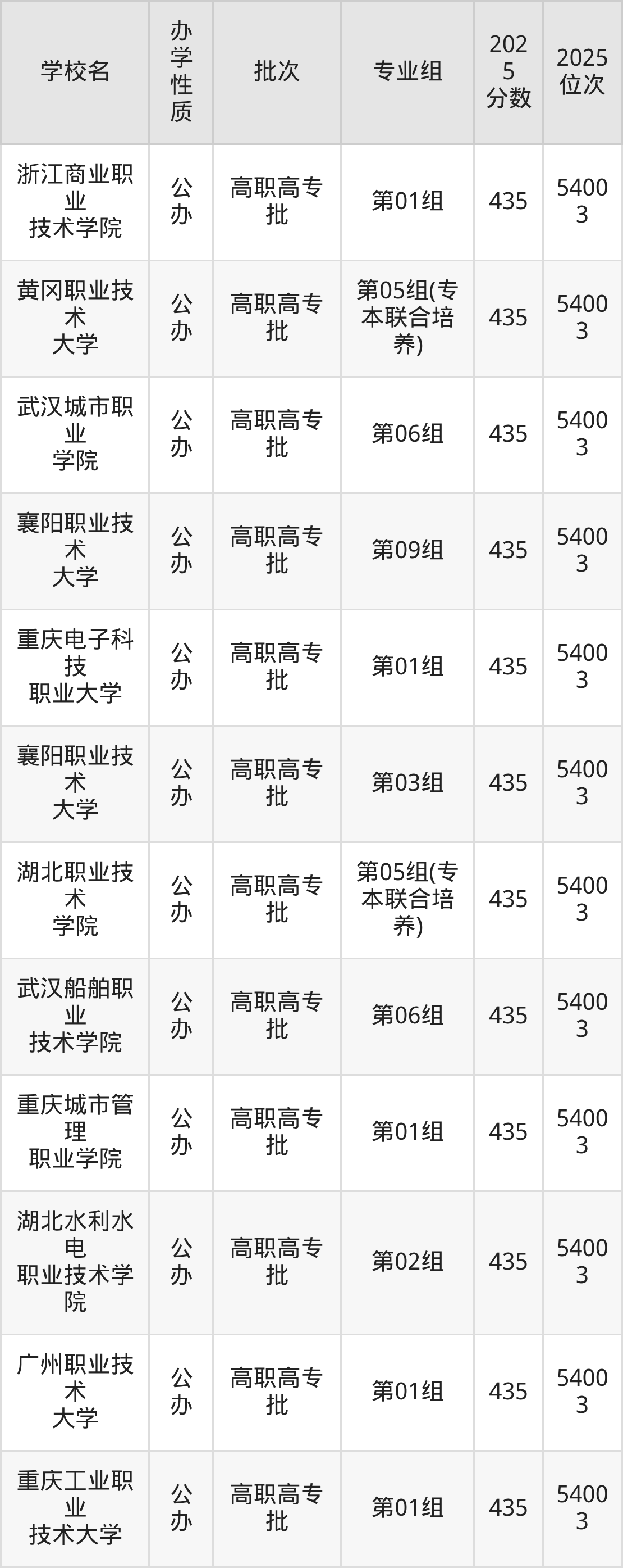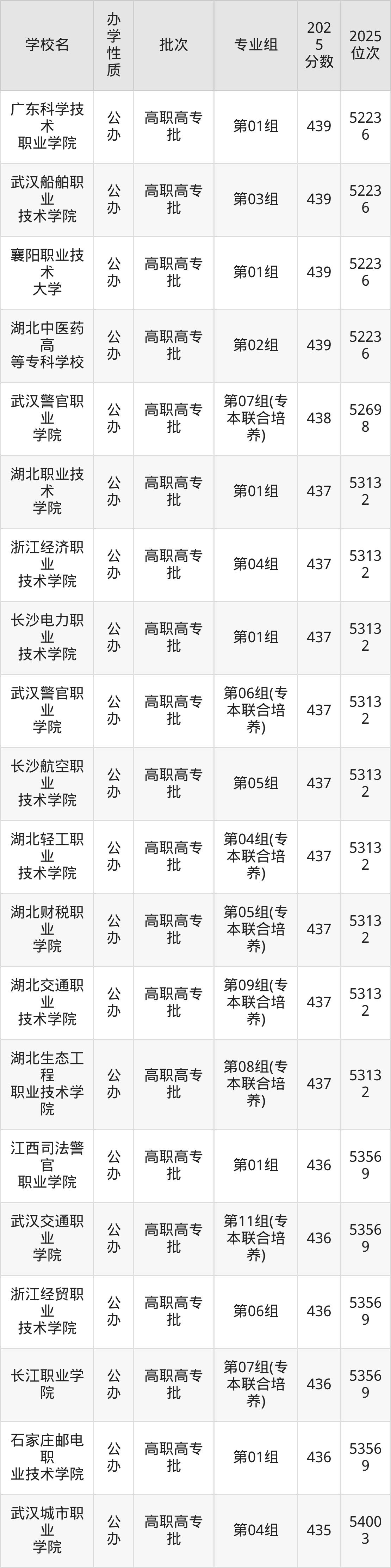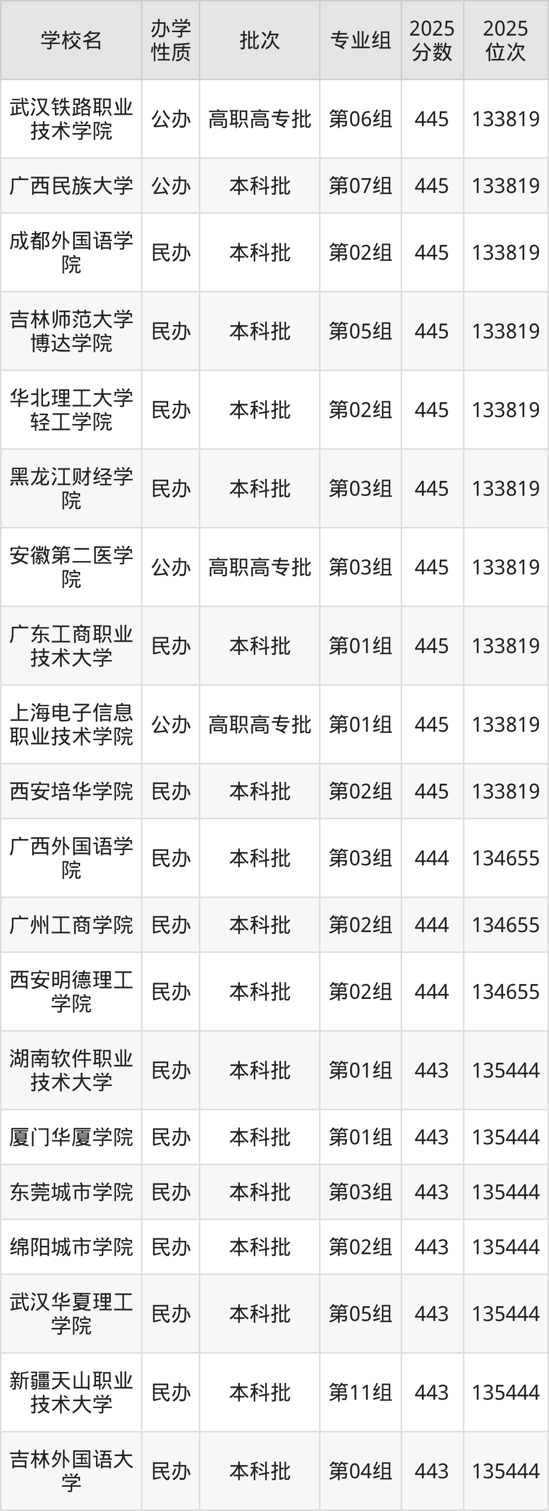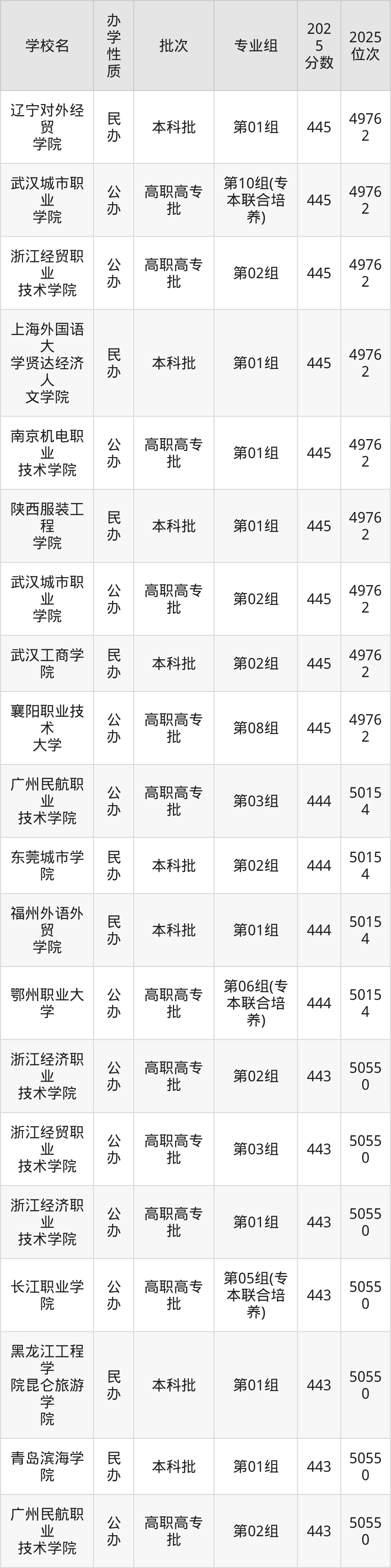 历史组方向440分左右录取的大学中,多数为普通类专业组,刚好为440分的有:成都职业技术学院第01组、武汉铁路职业技术学院第02组、广州民航职业技术学院第01组、武汉城市职业学院第03组等。此外还包含有专本联合培养,具体如下: