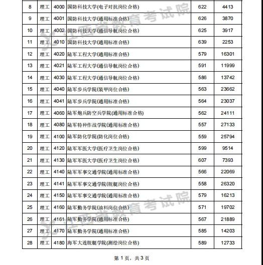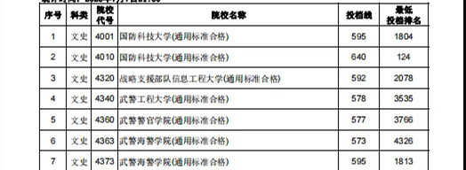 此外分数较低的专业组还有武警警官学院(通用标准)(577分)、武警工程大学(通用标准)(578分)。