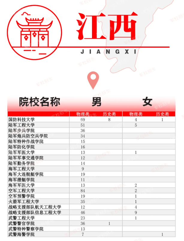 2024年在江西招生的军校22所,包含国防科技大学、陆军工程大学、陆军装甲兵学院、陆军特种作战学院、陆军边海防学院、陆军军医大学、海军航空大学、海军军医大学、武警工程大学。关于这些院校面向物理类和历史类具体招生的人数,详情如下: