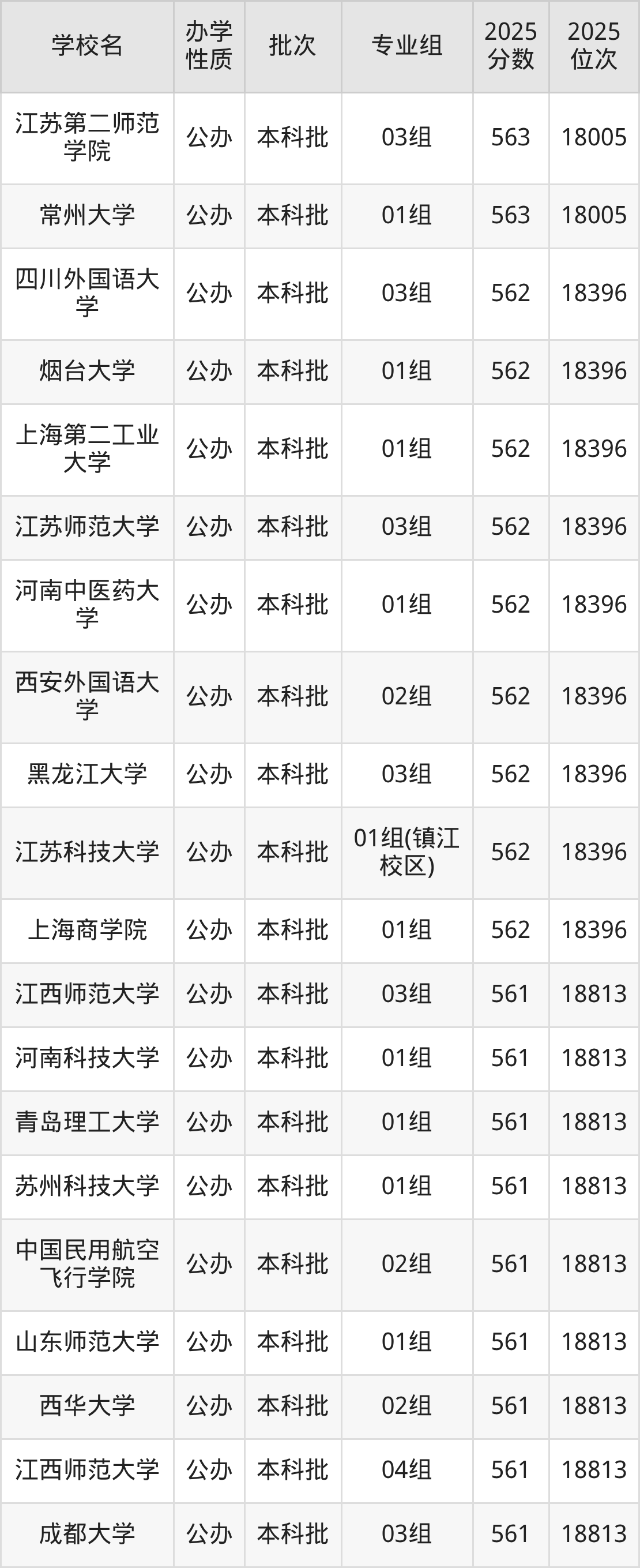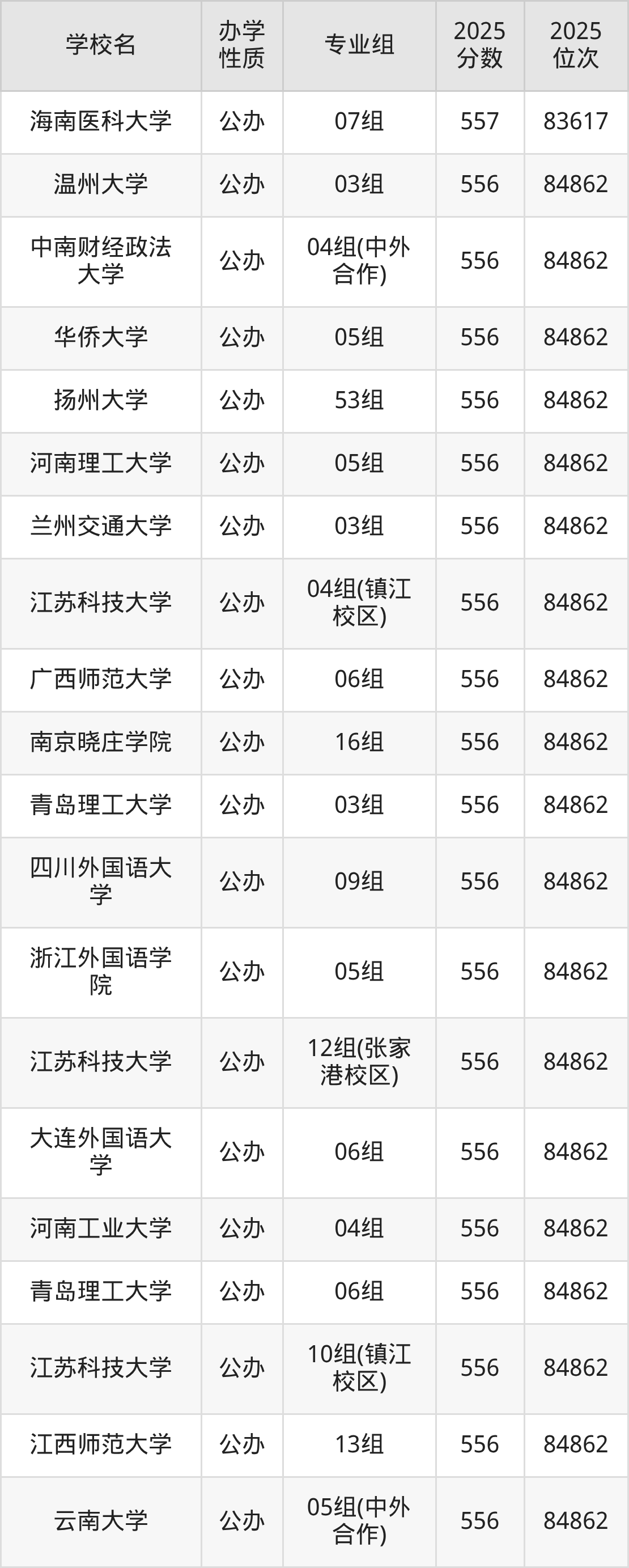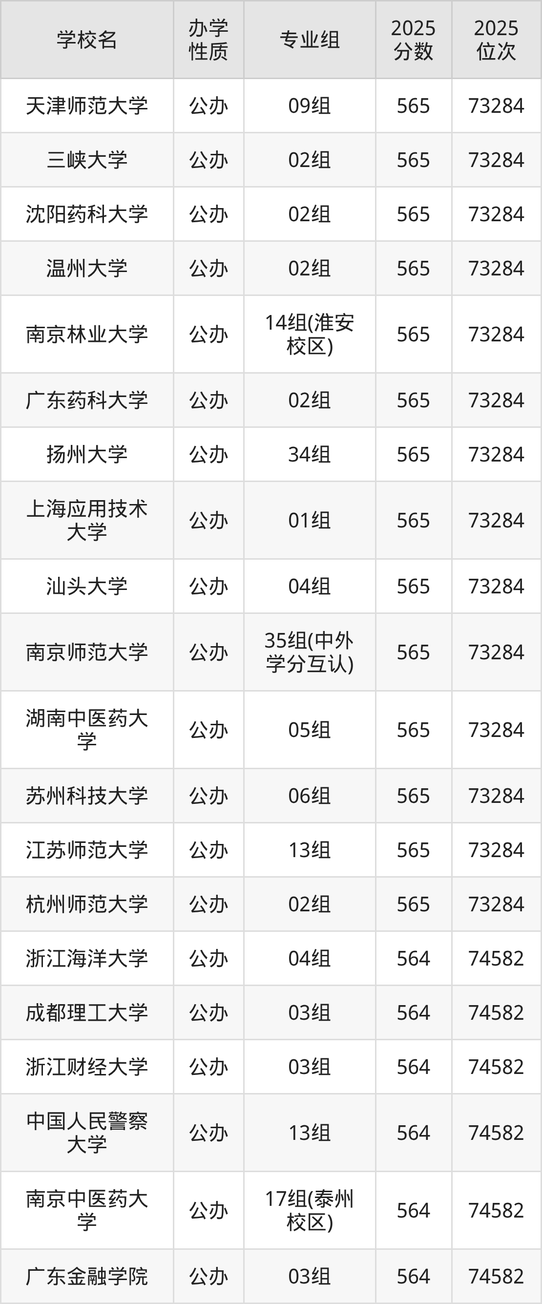 物理组方向560分左右录取的大学中,有198个为普通类专业组,还有1个淮安校区专业组(南京林业大学14组565分),1个中外学分互认专业组(南京师范大学35组565分),1个泰州校区专业组(南京中医药大学17组564分),3个中外合作专业组(扬州大学44组563分、沈阳农业大学02组563分等),3个南京校区专业组(南京中医药大学16组562分、浙江海洋大学03组562分等),10个镇江校区专业组(江苏科技大学09组561分、江西理工大学04组560分等),9个张家港校区专业组(江苏科技大学06组557分、中南财经政法大学04组556分等)。