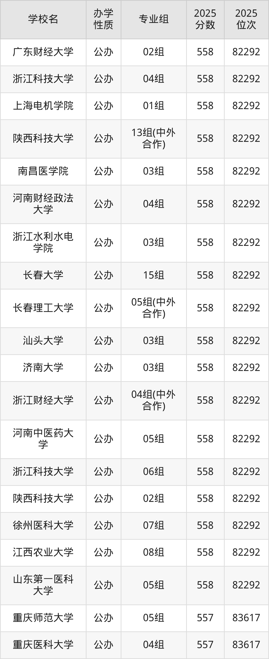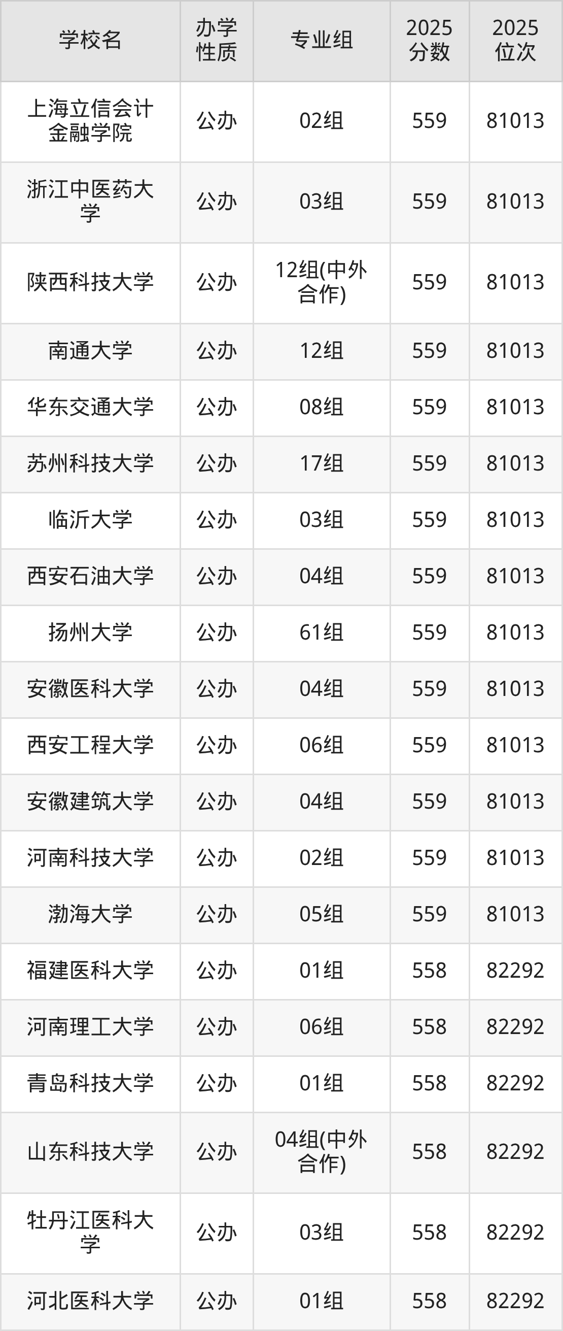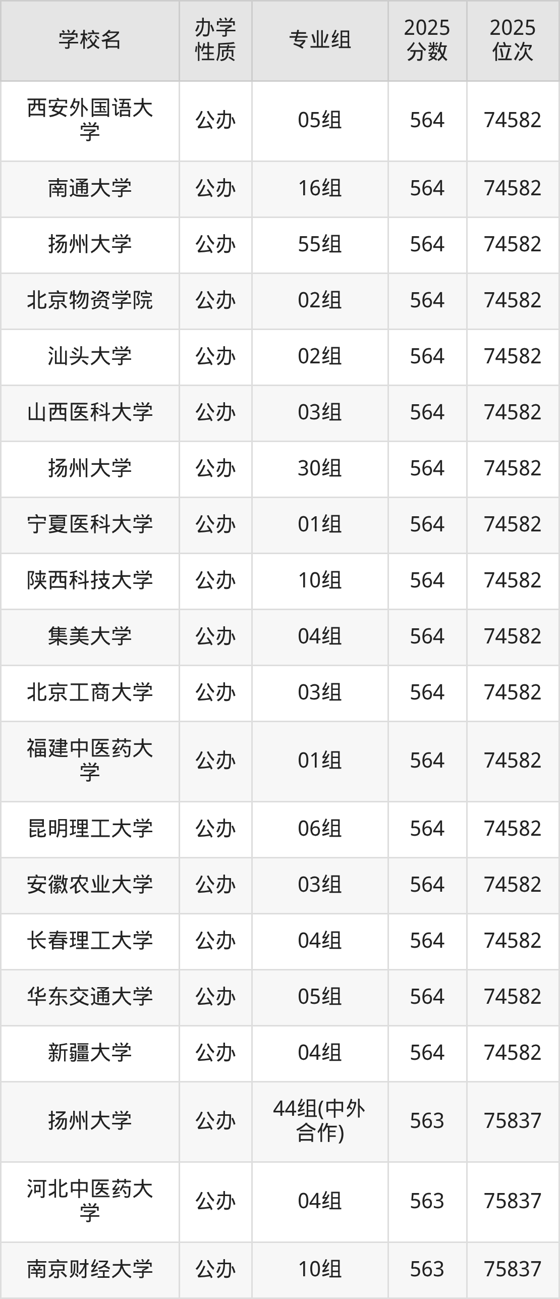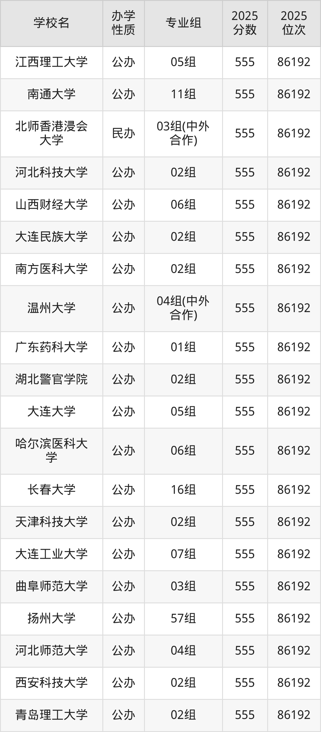 物理组方向560分左右录取的大学中,有198个为普通类专业组,还有1个淮安校区专业组(南京林业大学14组565分),1个中外学分互认专业组(南京师范大学35组565分),1个泰州校区专业组(南京中医药大学17组564分),3个中外合作专业组(扬州大学44组563分、沈阳农业大学02组563分等),3个南京校区专业组(南京中医药大学16组562分、浙江海洋大学03组562分等),10个镇江校区专业组(江苏科技大学09组561分、江西理工大学04组560分等),9个张家港校区专业组(江苏科技大学06组557分、中南财经政法大学04组556分等)。