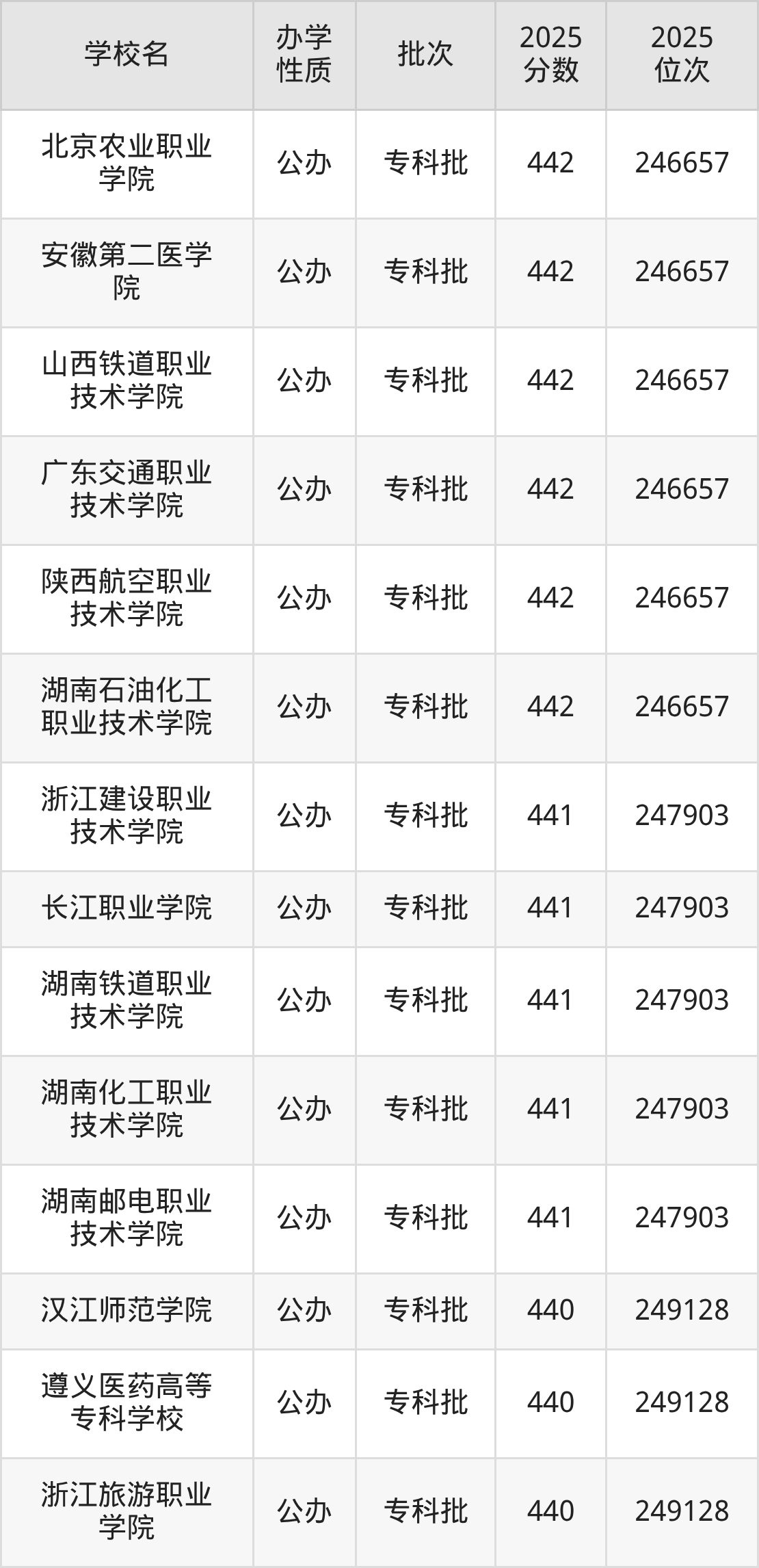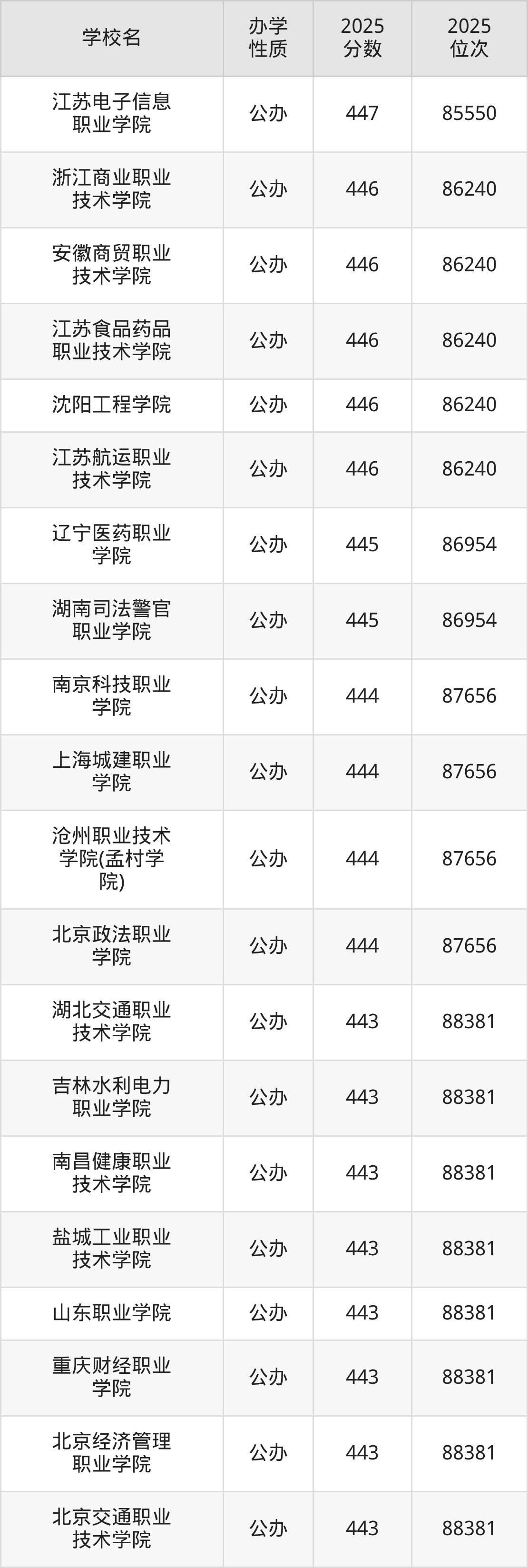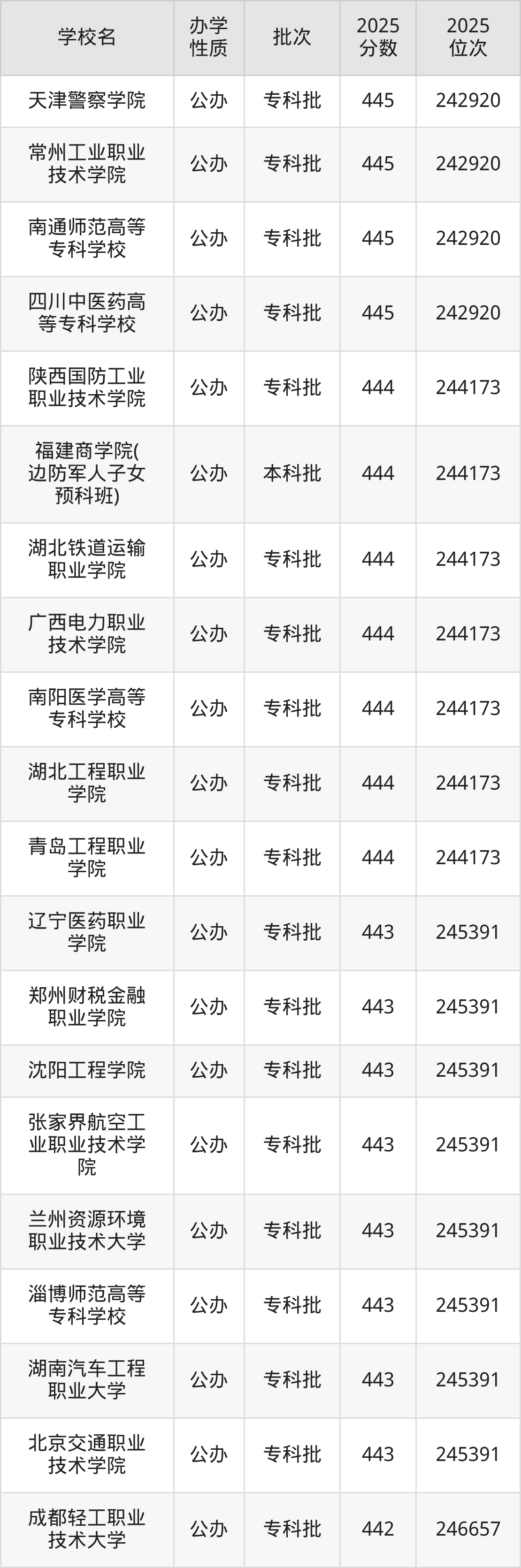 历史组:445分左右能上的最好专科批大学为上海民航职业技术学院,该校为中央部属,2025年最低分是442分。