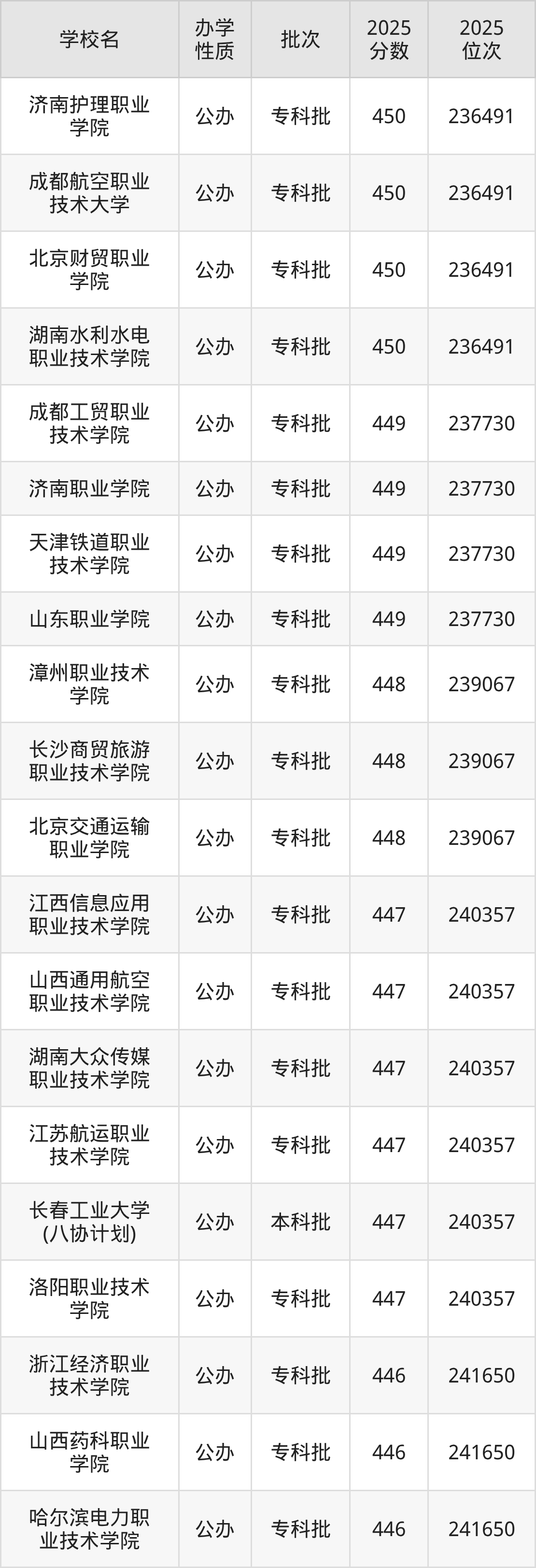 物理组:445分左右能上的最好本科批大学为长春工业大学(八协计划),该校为公办本科,2025年最低分是447分。能上的最好专科批大学为北京农业职业学院,该校为国家重点,2025年最低分是442分。