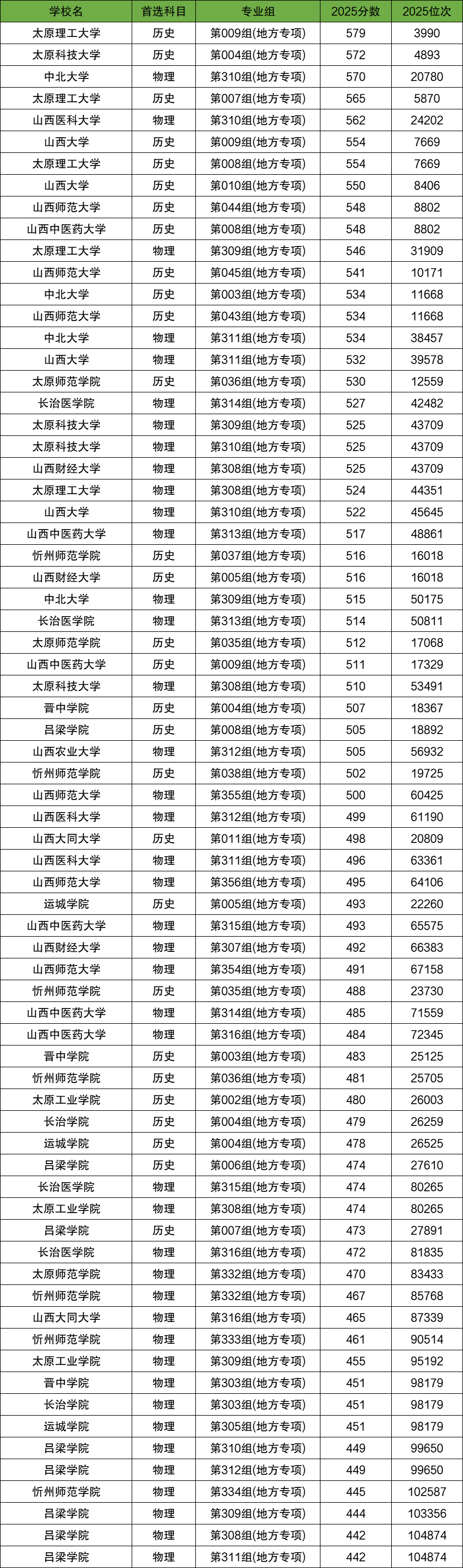 2025年山西省地方专项计划历史类最低473分,录取学校为吕梁学院;物理类最低442分,录取学校为吕梁学院。