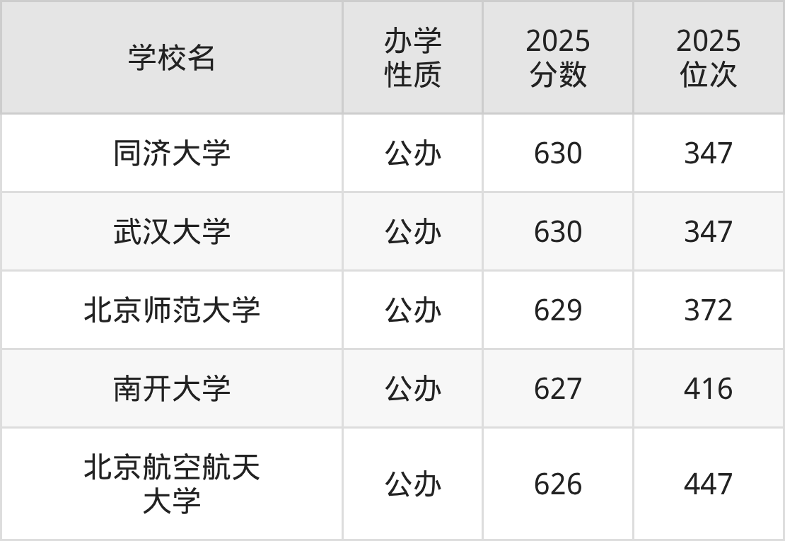 历史组:630分左右能上的最好本科批大学为同济大学,该校为985,2025年最低分是630分。