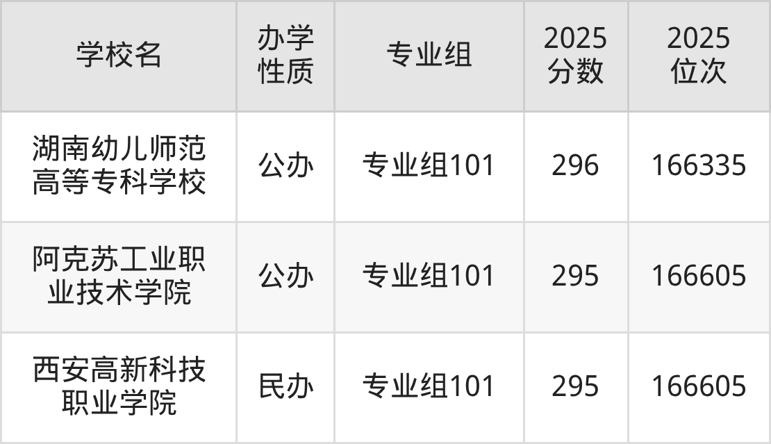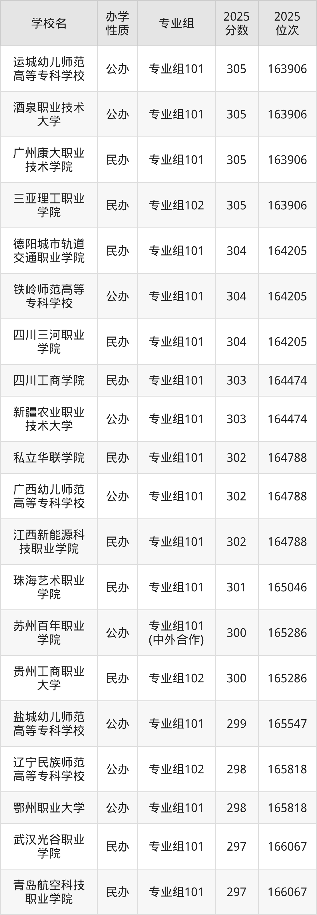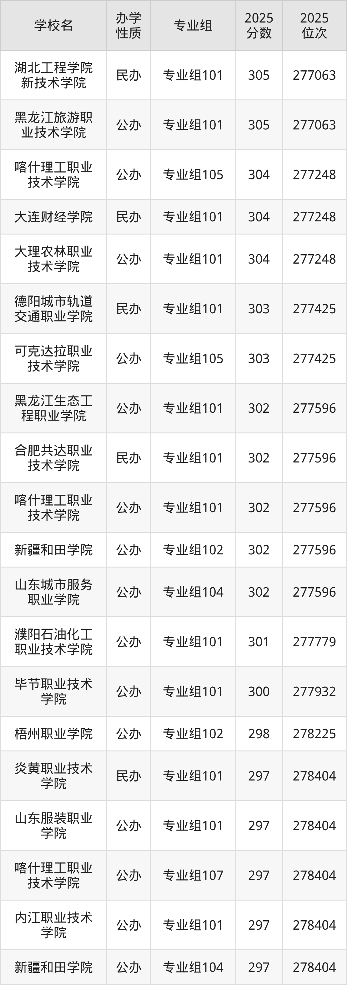 物理组:300分左右能上的最好高职专科批大学为湖北工程学院新技术学院,该校为双万计划,2025年专业组101最低分是305分。