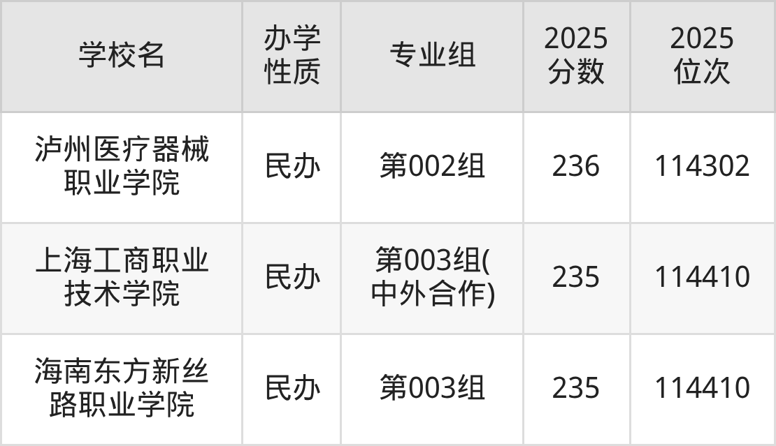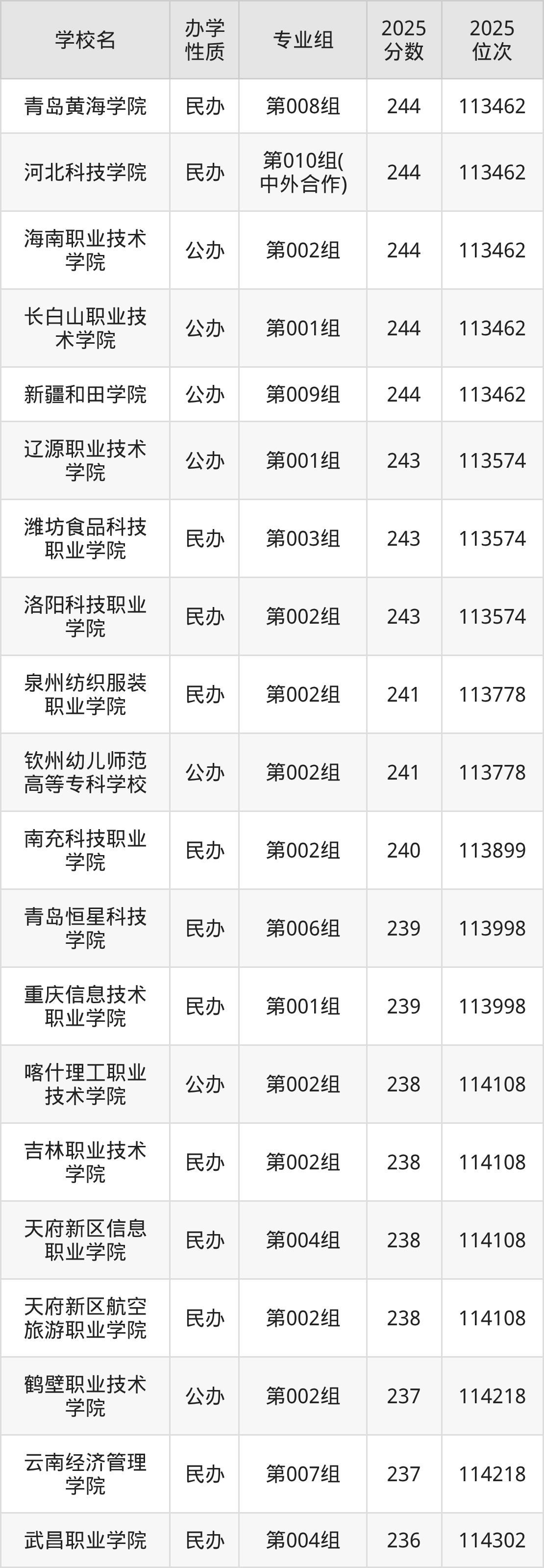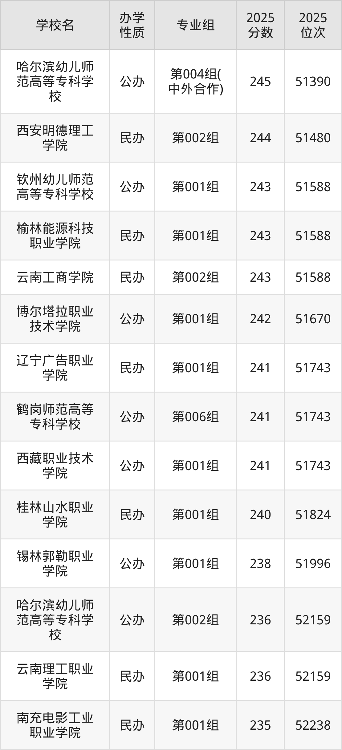 物理组:240分左右能上的最好高职专科批大学为辽源职业技术学院,该校为省重点,2025年第001组最低分是243分。
