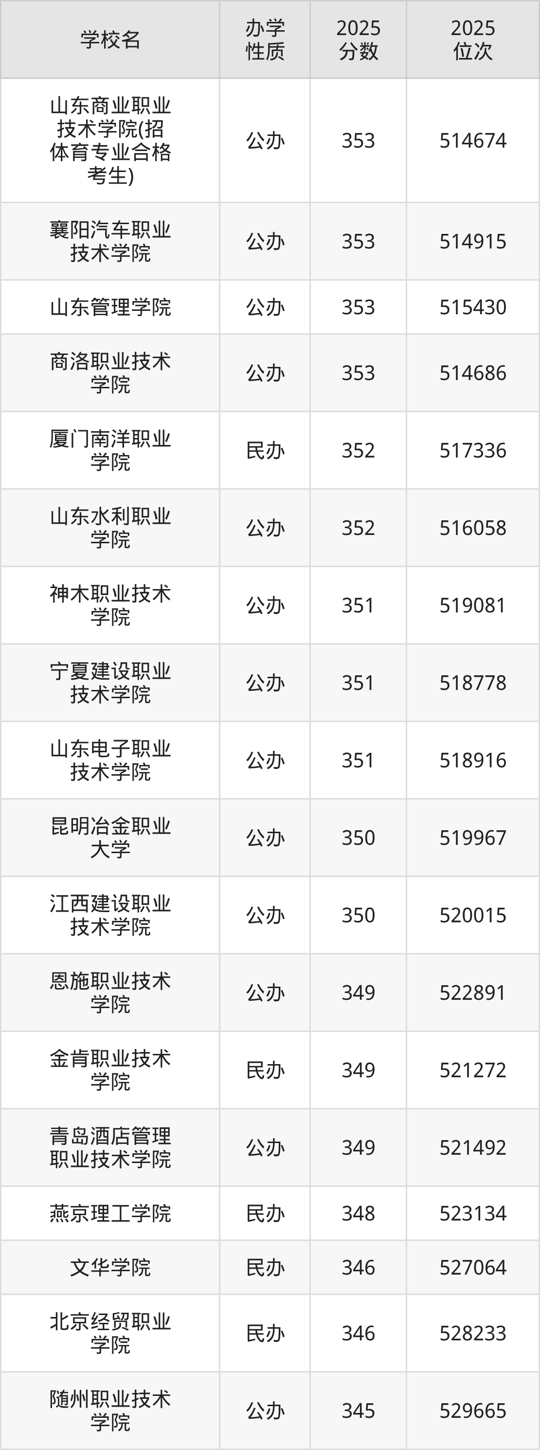 350分左右录取的大学中,包含13所公办大学,刚好为350分的有:昆明冶金职业大学、江西建设职业技术学院等;包含5所民办大学。具体如下:
