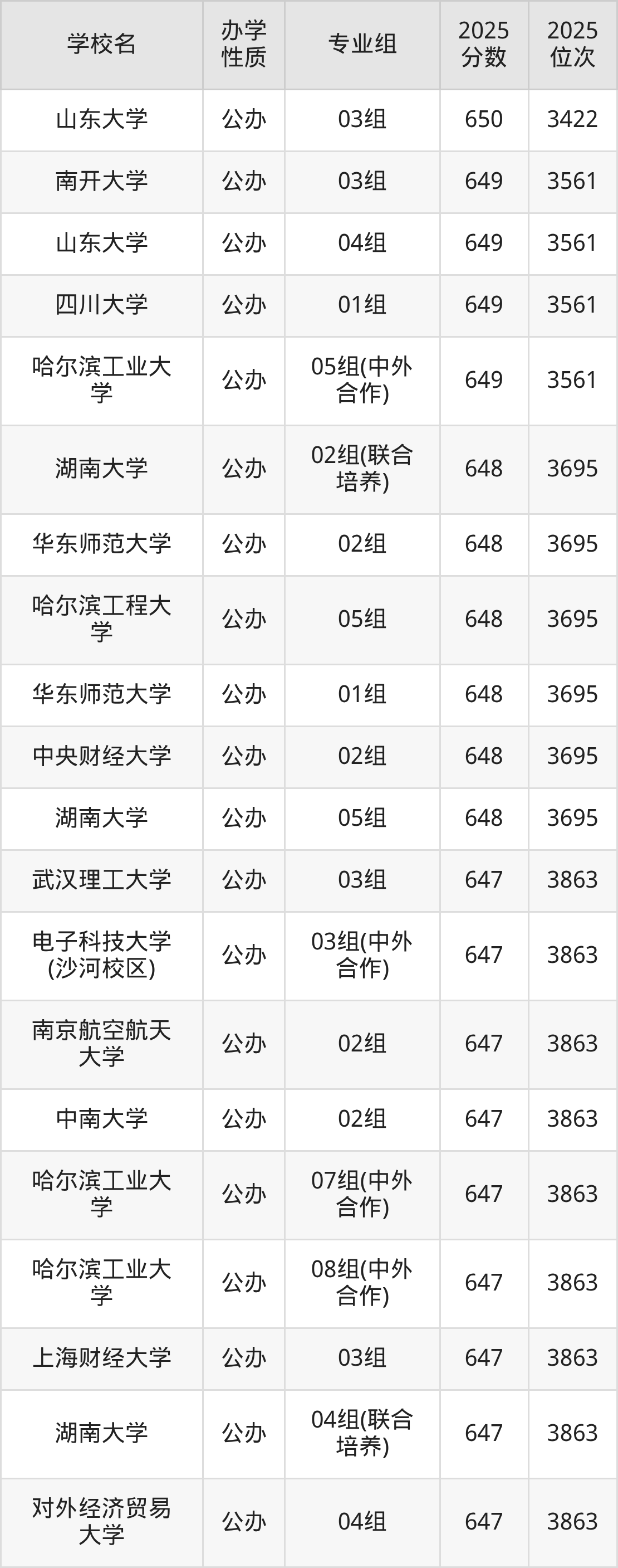 650分左右录取的大学中,包含2个中外合作专业组,分别是电子科技大学(沙河校区)02组(654分)、哈尔滨工业大学05组(649分);多数为普通类专业组,刚好为650分的有:中山大学01组、哈尔滨工程大学04组、山东大学03组。此外还包含有联合培养,具体如下: