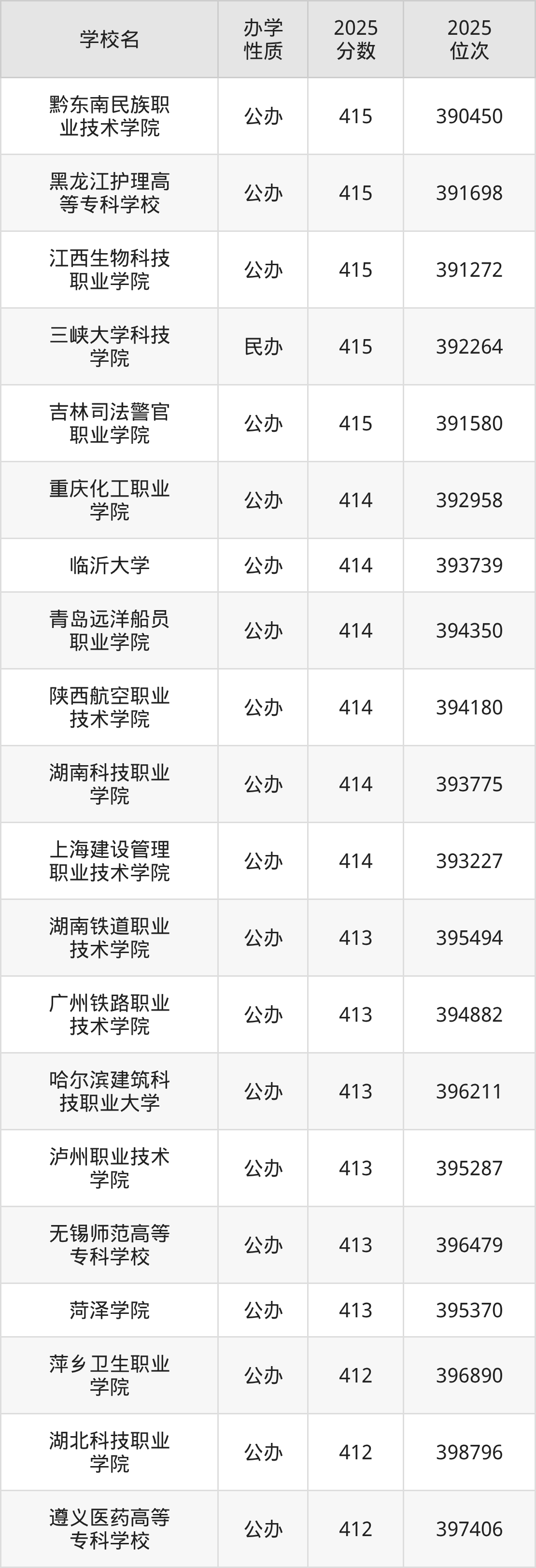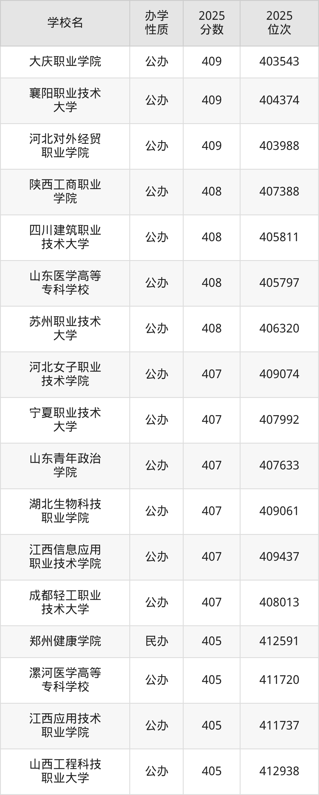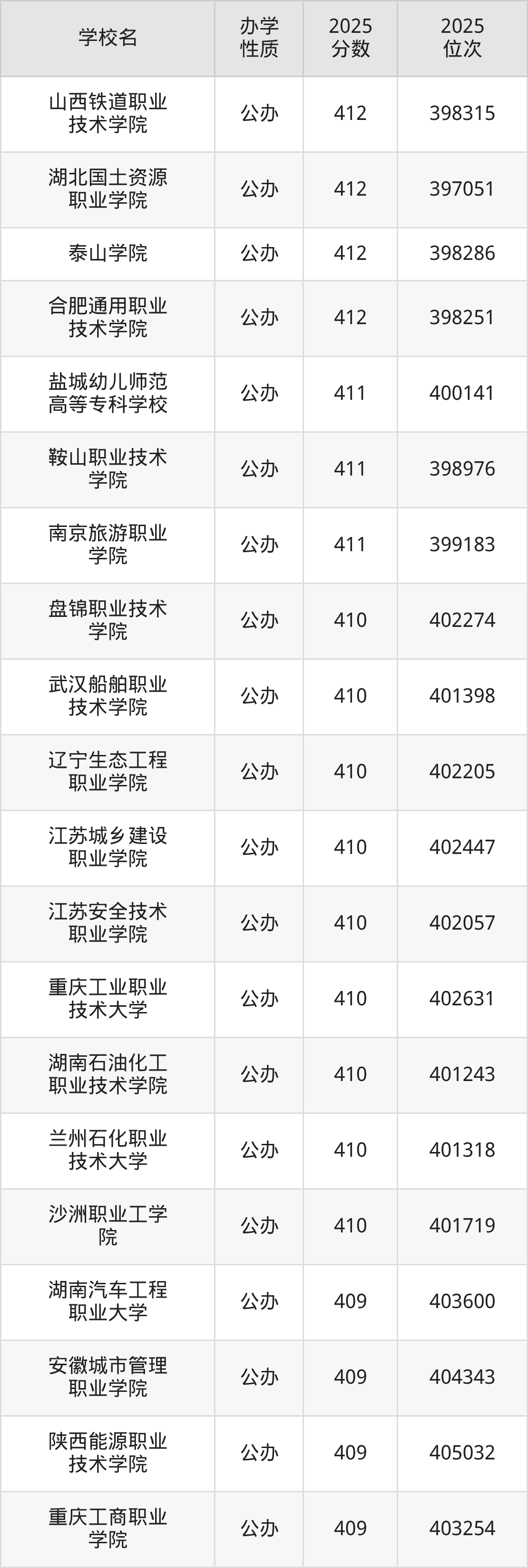 410分左右录取的大学中,包含55所公办大学,刚好为410分的有:盘锦职业技术学院、武汉船舶职业技术学院、辽宁生态工程职业学院、江苏城乡建设职业学院、江苏安全技术职业学院、重庆工业职业技术大学、湖南石油化工职业技术学院、兰州石化职业技术大学、沙洲职业工学院等;包含2所民办大学。具体如下: