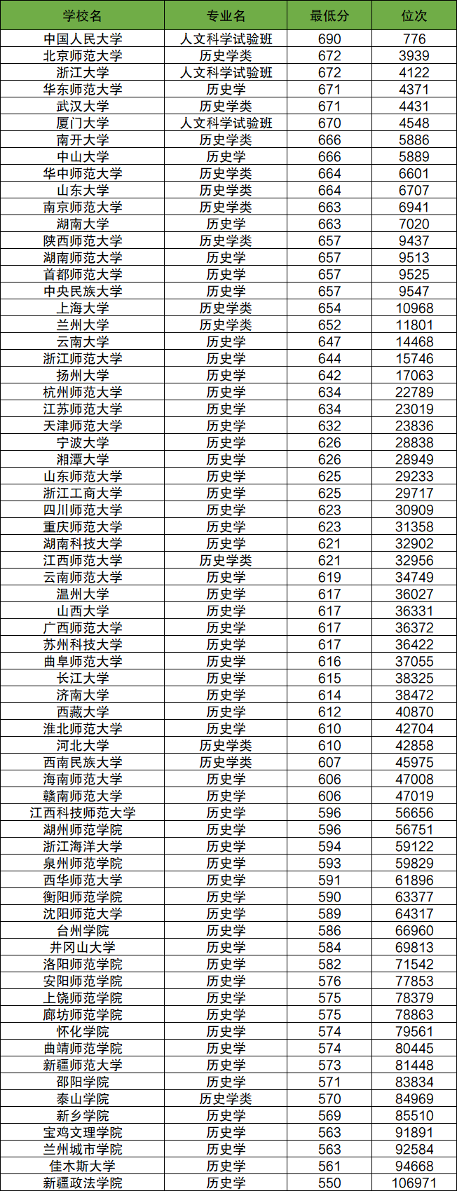 以下为全国历史学专业在浙江省的分数线前100名大学,上文已介绍最好的大学多少分能上。想要考上历史学专业的最低分并不高,为550分,只要在全省106971名以上就有机会。