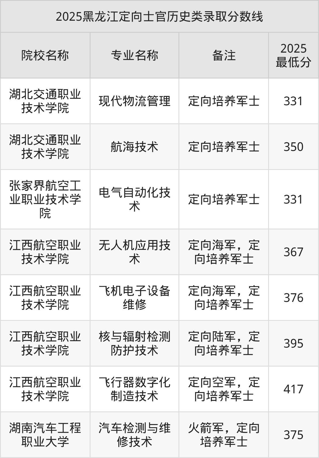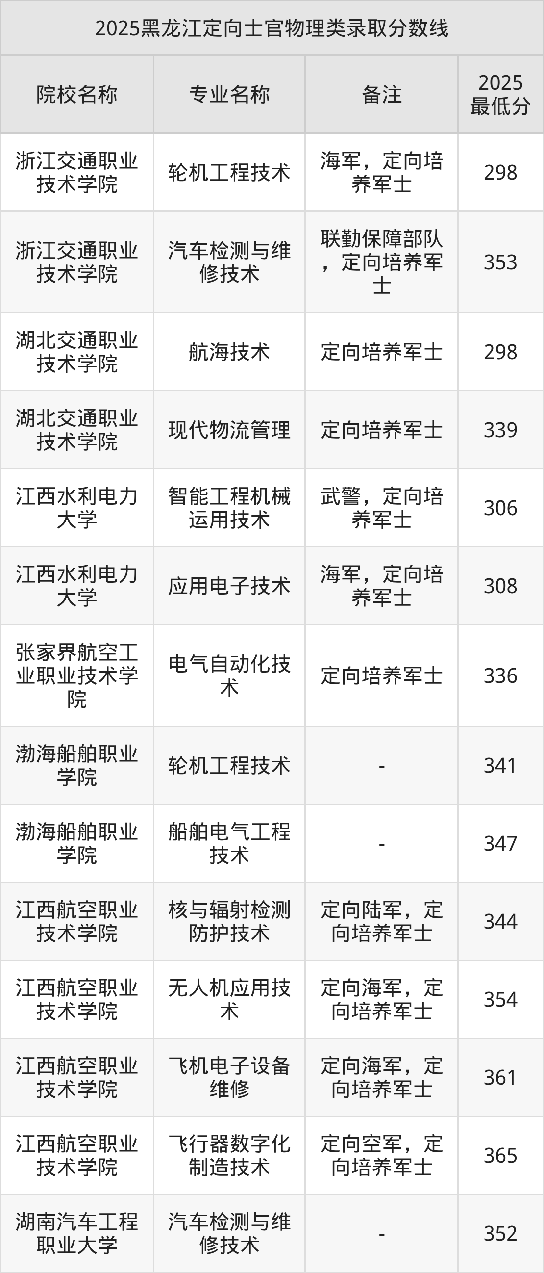目前能查询到的黑龙江最新公开定向士官录取分数线表为2025年数据,2026届考生可暂做参考(不完全统计):