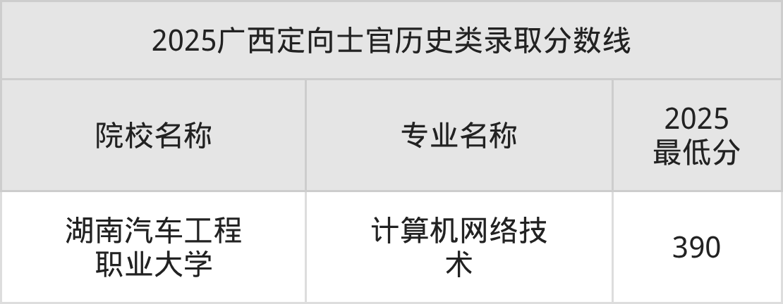 已公布大学数据显示,广西定向士官历史类录取分数线为390分的大学是湖南汽车工程职业大学(计算机网络技术专业),该校位于湖南省,2025年在广西定向士官历史类招生人数为2人。