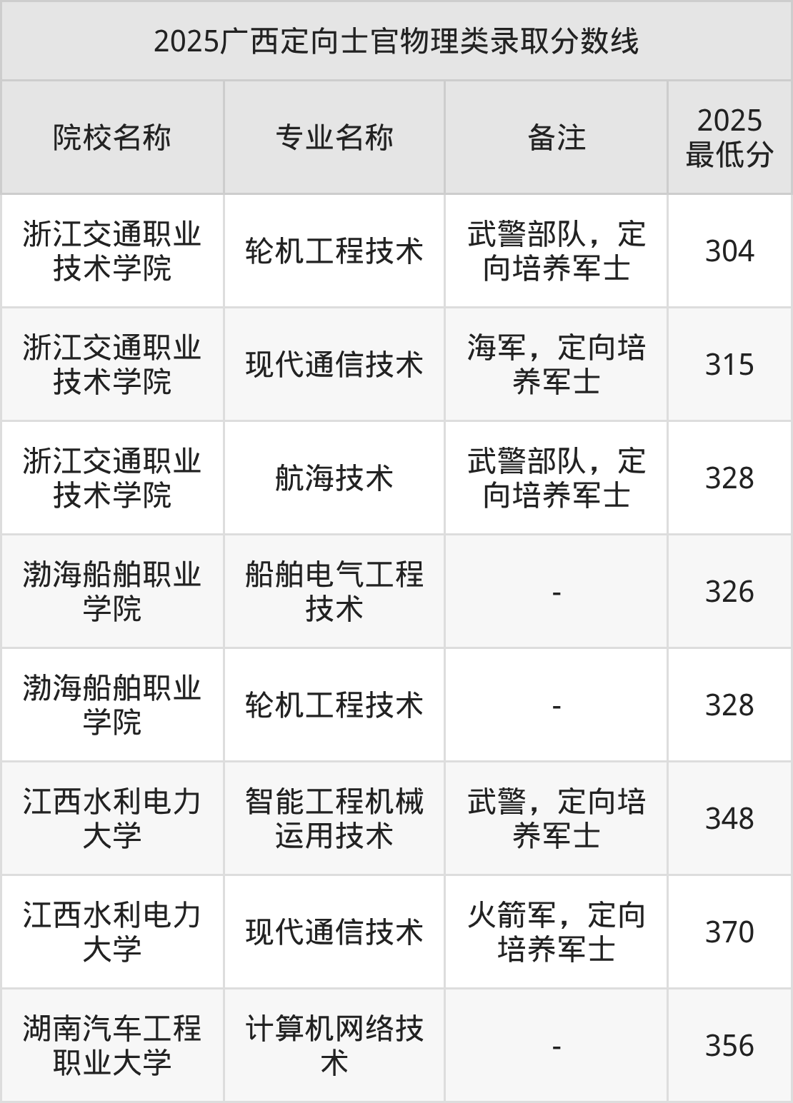 目前能查询到的广西最新公开定向士官录取分数线表为2025年数据,2026届考生可暂做参考(不完全统计):