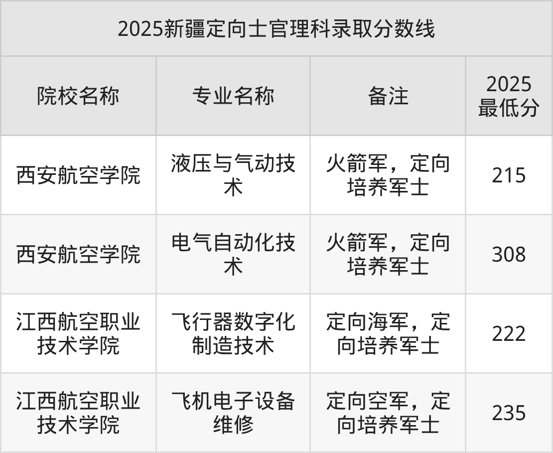 目前能查询到的新疆最新公开定向士官录取分数线表为2025年数据,2026届考生可暂做参考(不完全统计):