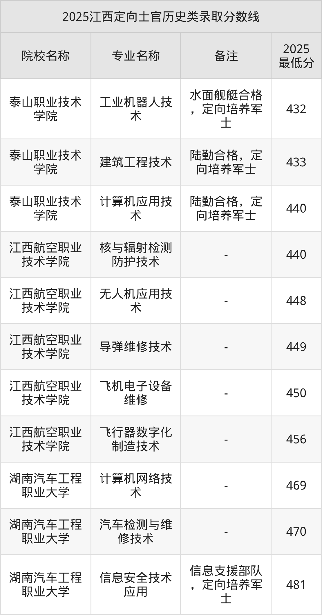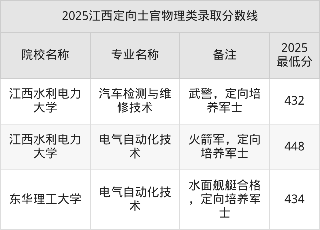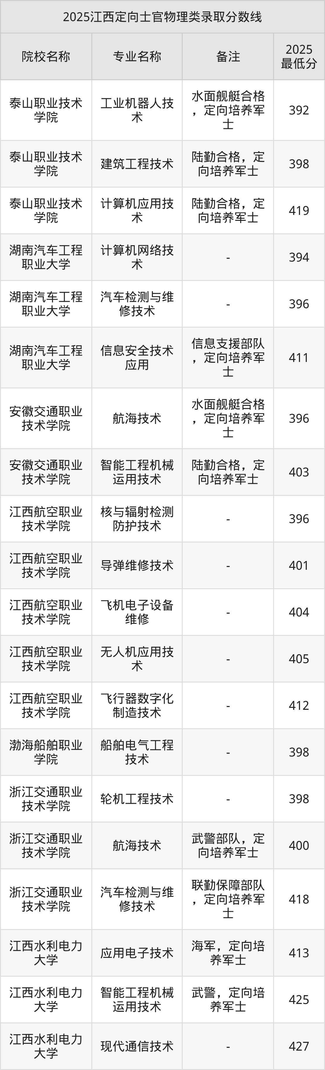 目前能查询到的江西最新公开定向士官录取分数线表为2025年数据,2026届考生可暂做参考(不完全统计):
