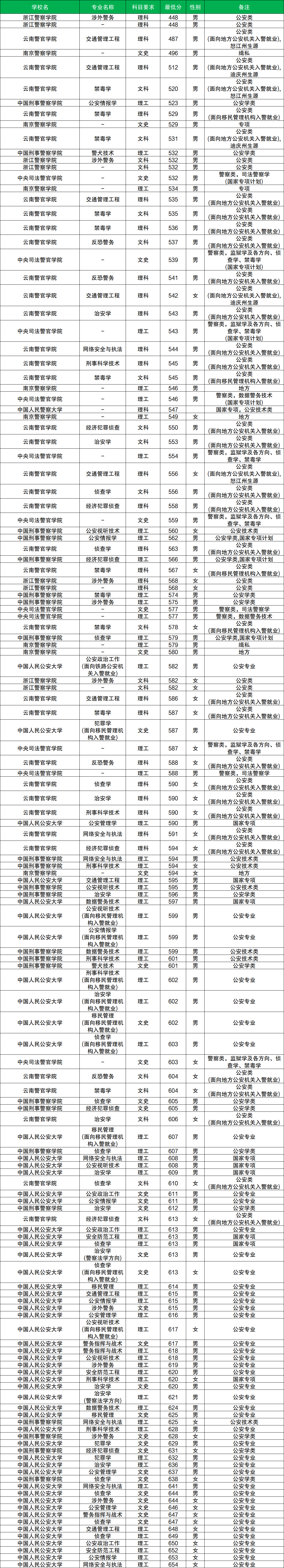 文史类男生分数至少在496分及以上、女生分数至少在578分及以上才有机会被录取,而文史类男生分数最低的院校是南京警察学院,文史类女生分数最低的院校是云南警官学院(禁毒学专业)。