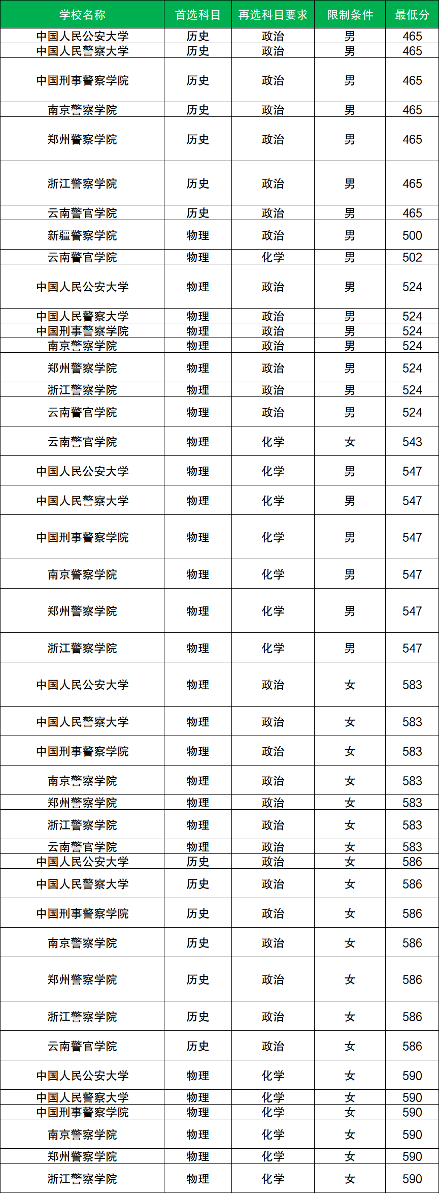 其中物理类男生分数至少在500分及以上、女生分数至少在543分及以上才有机会参与体检进而过关被投档,而物理类男生分数最低的院校是新疆警察学院,物理类女生分数最低的院校是云南警官学院。