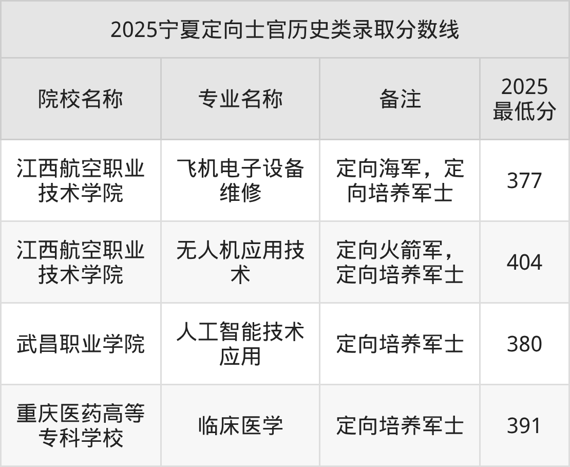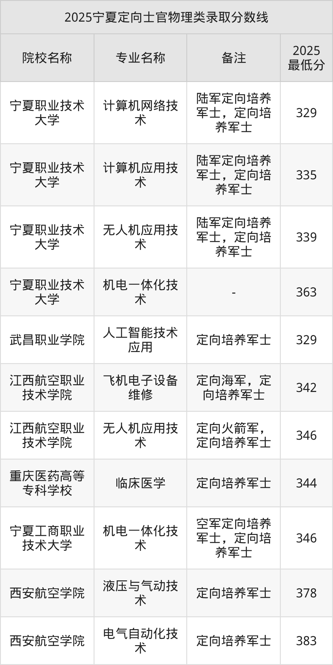 目前能查询到的宁夏最新公开定向士官录取分数线表为2025年数据,2026届考生可暂做参考(不完全统计):