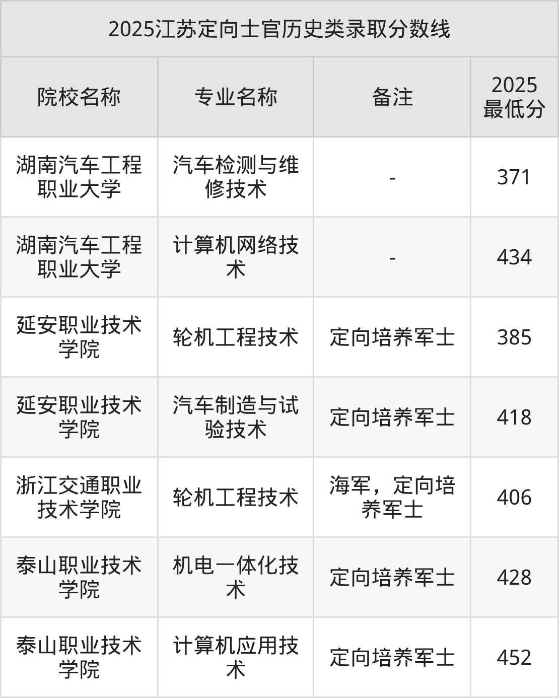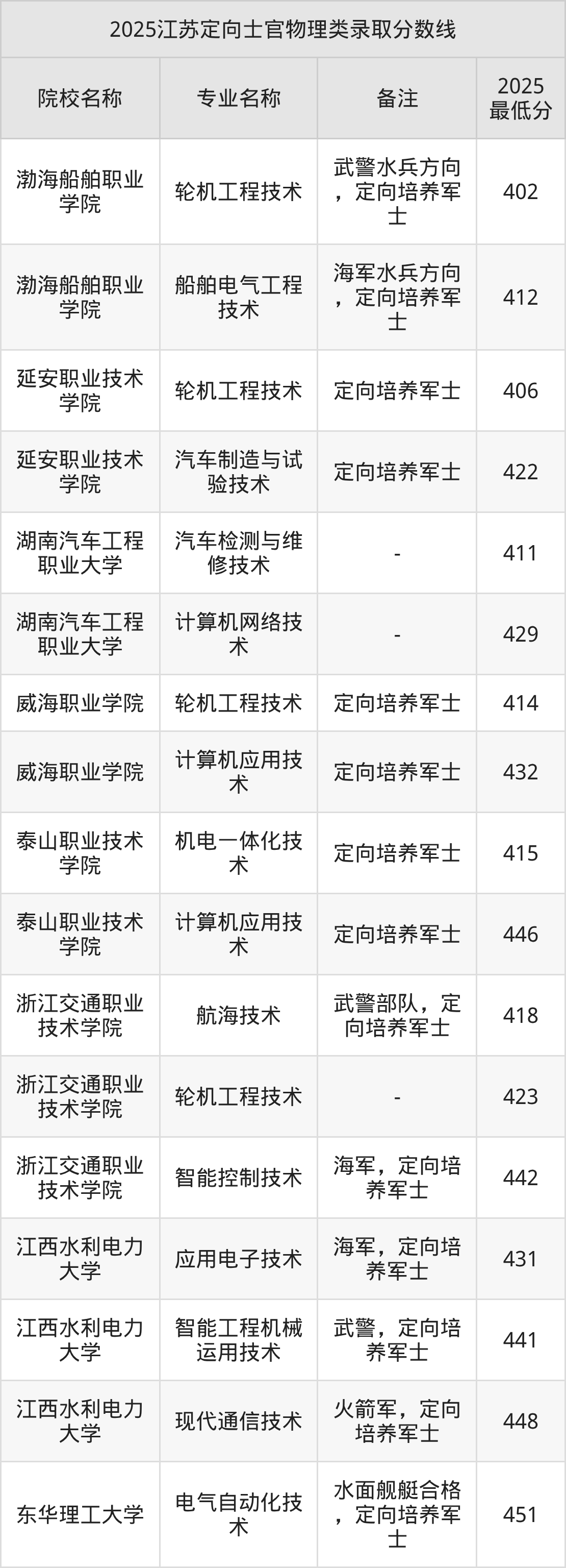 目前能查询到的江苏最新公开定向士官录取分数线表为2025年数据,2026届考生可暂做参考(不完全统计):