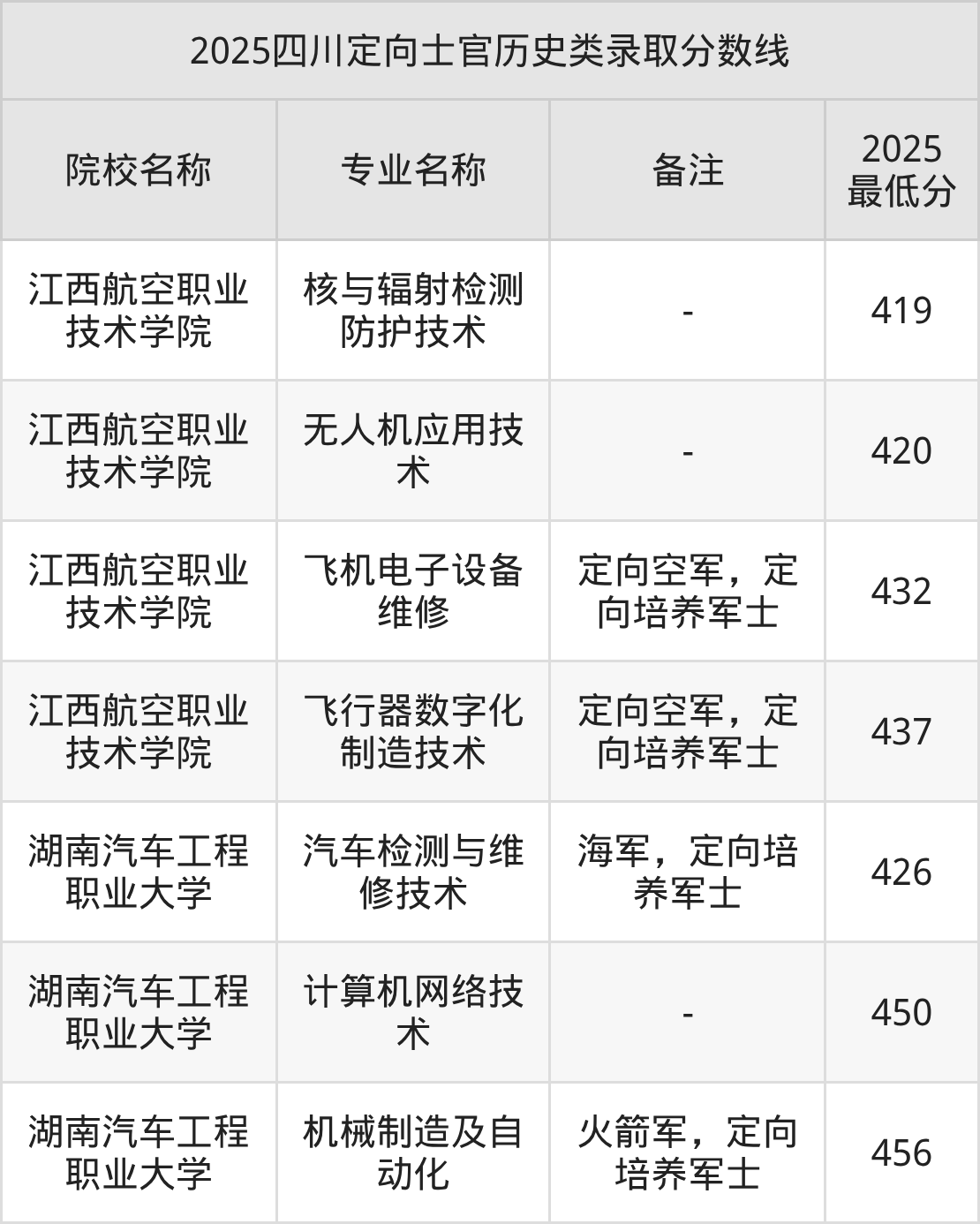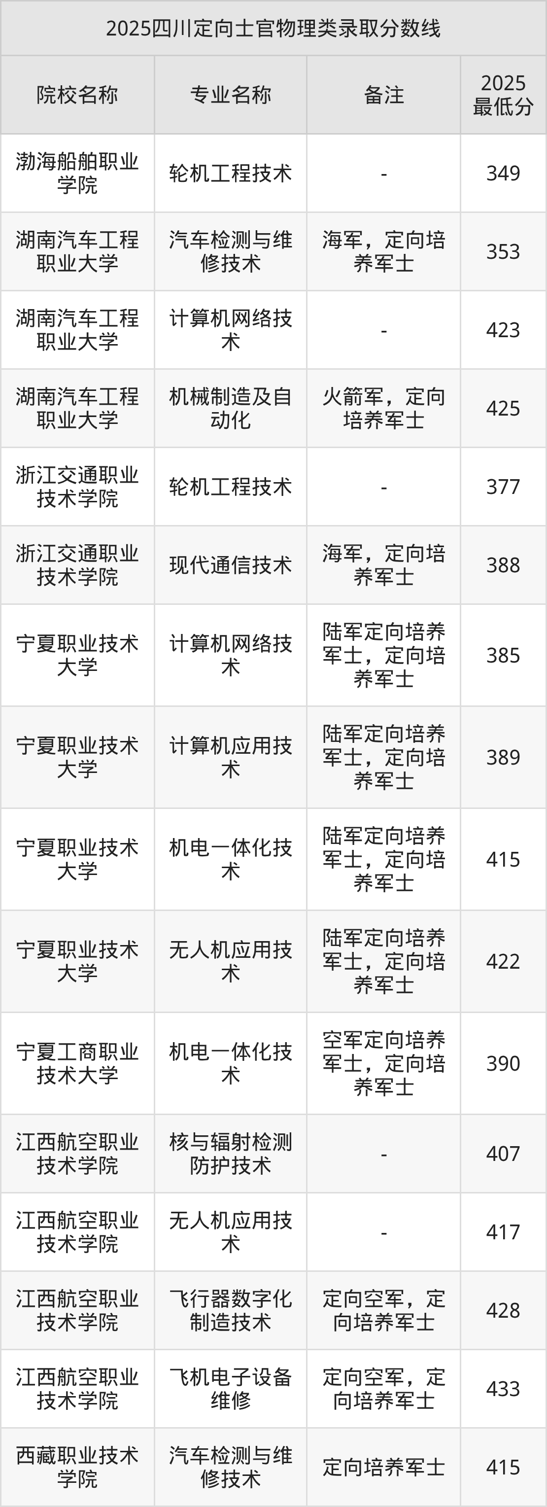 目前能查询到的四川最新公开定向士官录取分数线表为2025年数据,2026届考生可暂做参考(不完全统计):