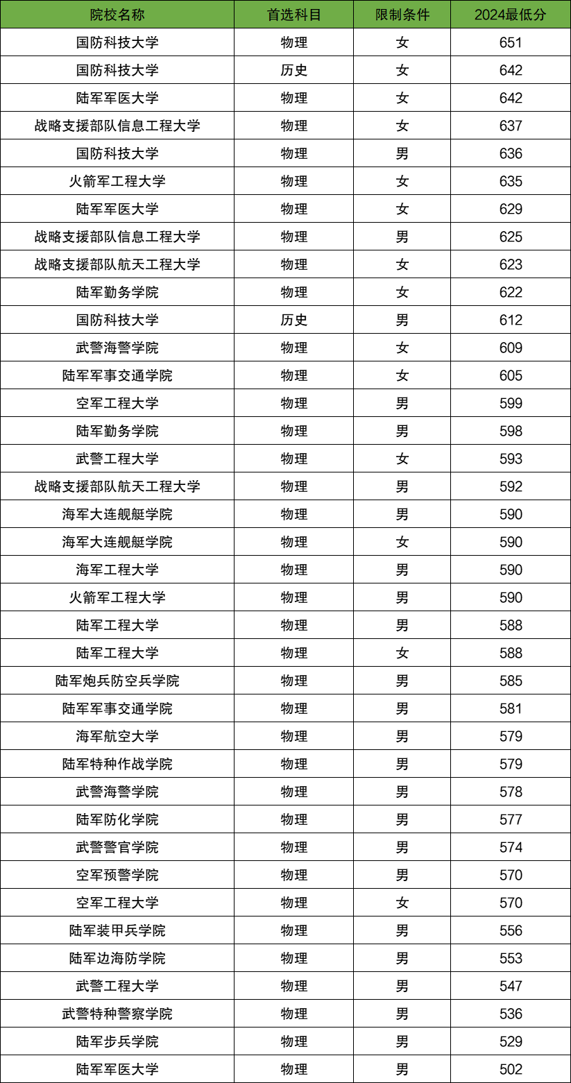 军校有国防科技大学(男生)(物理类最低636分)、陆军军医大学(男生)(物理类最低502分)、武警警官学院(男生)(物理类最低574分)、海军工程大学(男生)(物理类最低590分)等。