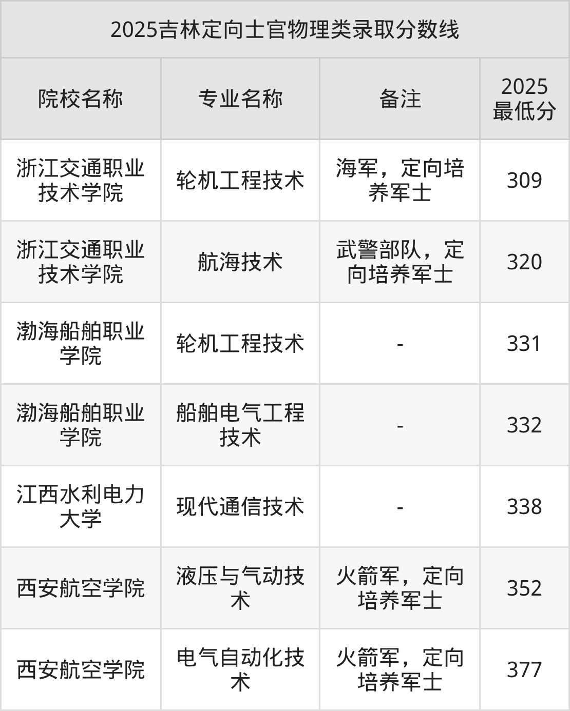 目前能查询到的吉林最新公开定向士官录取分数线表为2025年数据,2026届考生可暂做参考(不完全统计):