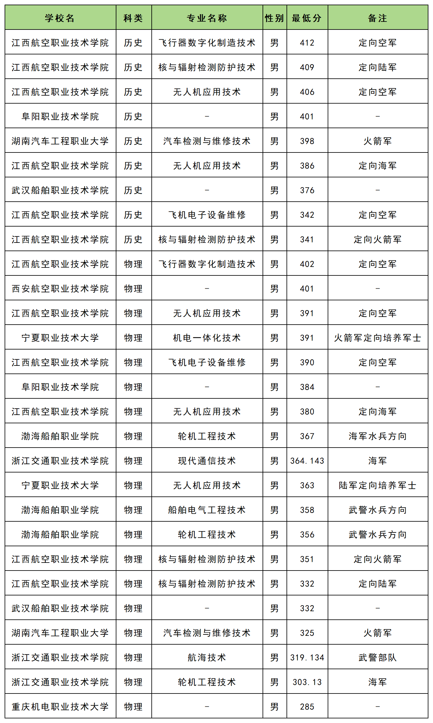 2025年山西定向士官历史类最低线是341分,对应收分最低的是江西航空职业技术学院核与辐射检测防护技术专业(男,定向火箭军)。