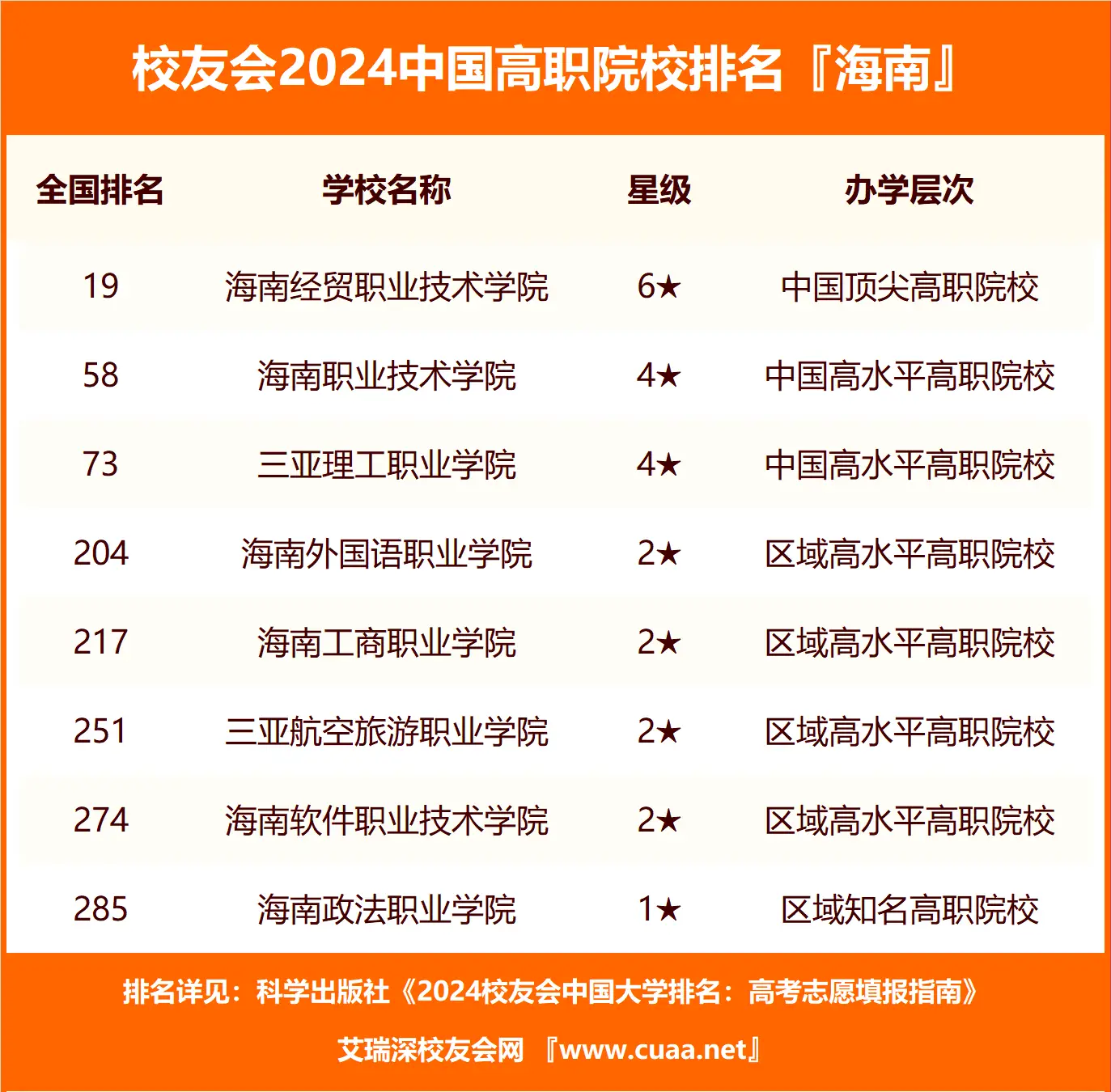 我们从校友会官方获取到了2024年全国高职专科院校的排名情况,同时我们为大家整理了2024年所有海南专科高职院校的排名数据如下: