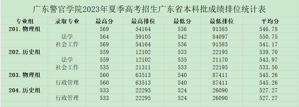 根据学校官网提供的招录数据可知,2023年学校在广东省录取分数线基本都在500分左右。其中在本科提前批次录取中,历史科目类招生最低的专业为禁毒学,最低438分,最低排名位次在91567名;物理科目类招生最低的专业为警务指挥与战术专业,最低448分,最低排名位次在222194名。