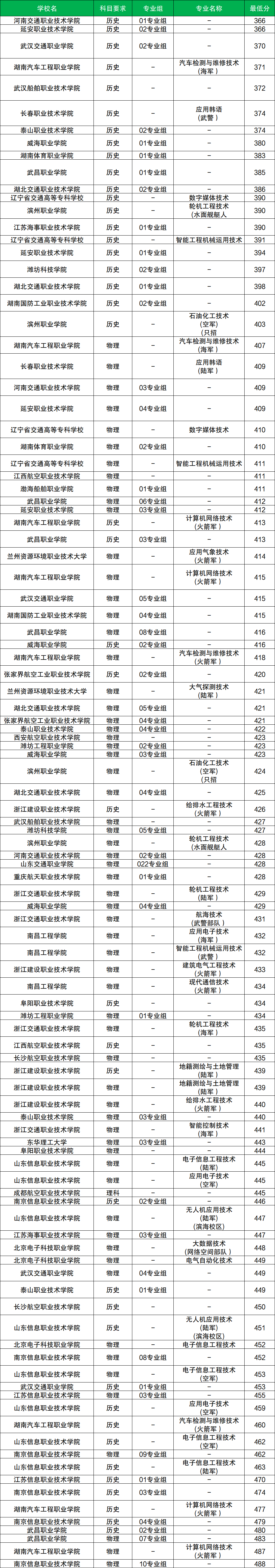 其中物理类分数至少在407分及以上、历史类分数至少在366分及以上才有机会被录取。而物理类分数最低的院校是湖南汽车工程职业学院,历史类分数最低的院校是河南交通职业技术学院(01专业组)、延安职业技术学院(02专业组)。