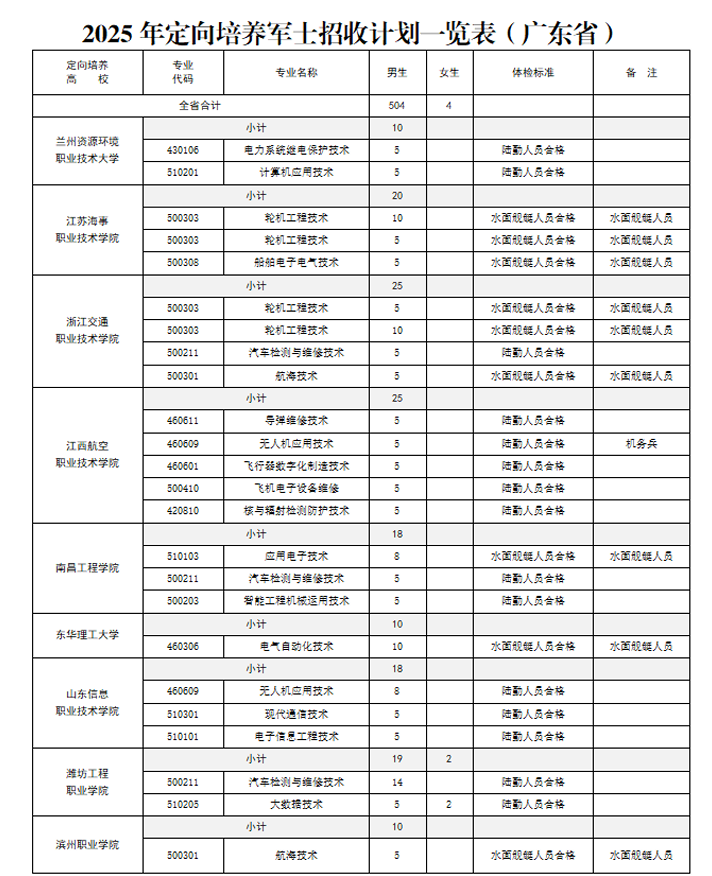 2025年全国定向培养士官学校在广东招生计划人数为508名,招生学校共有24所,下面是广东士官学校名单及招生计划。