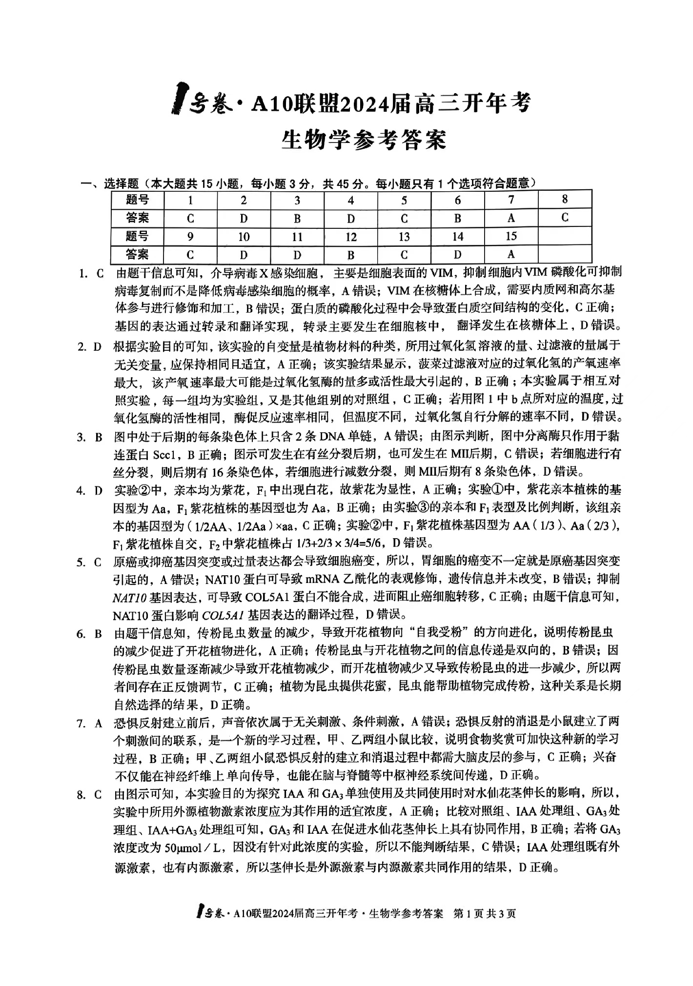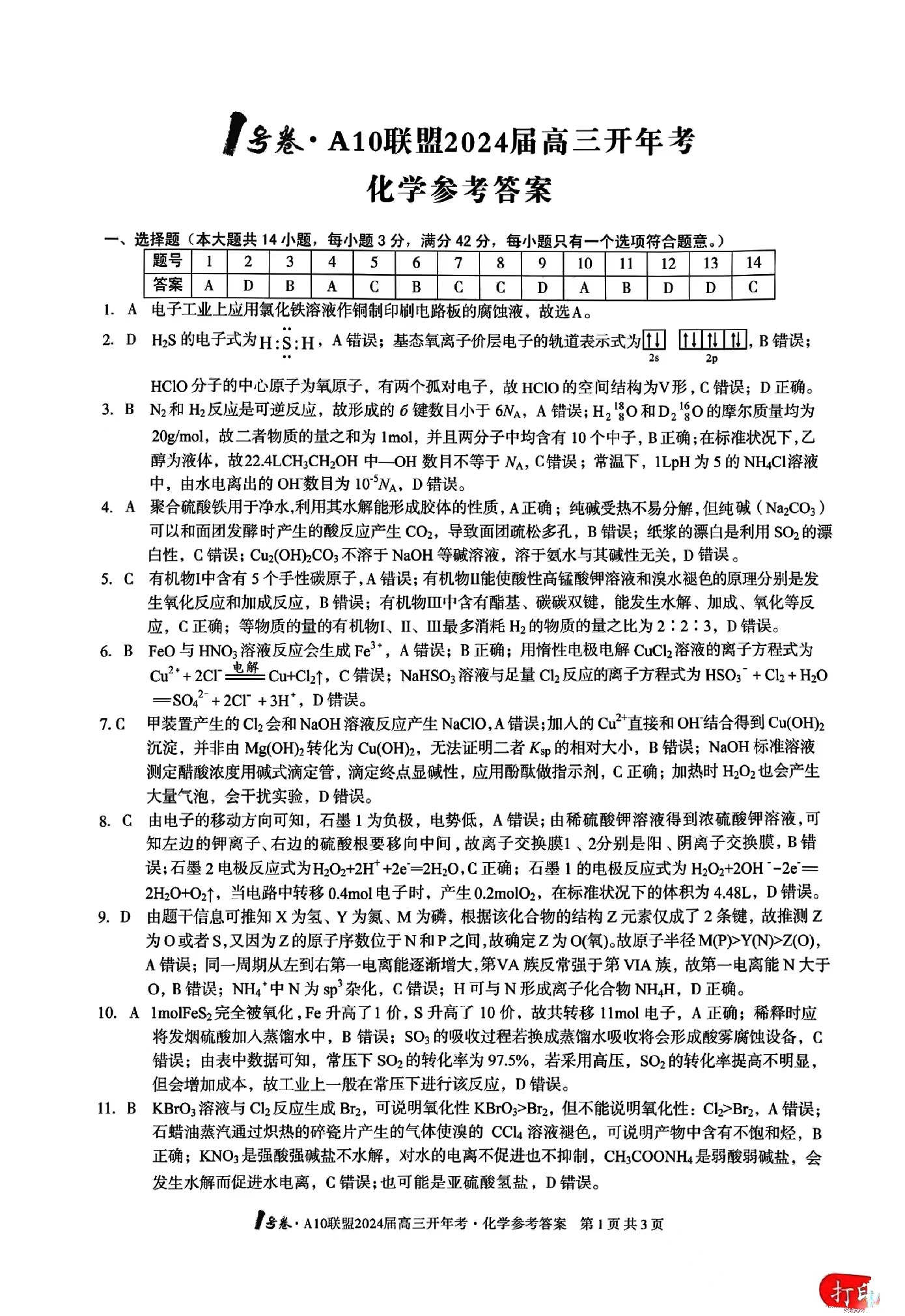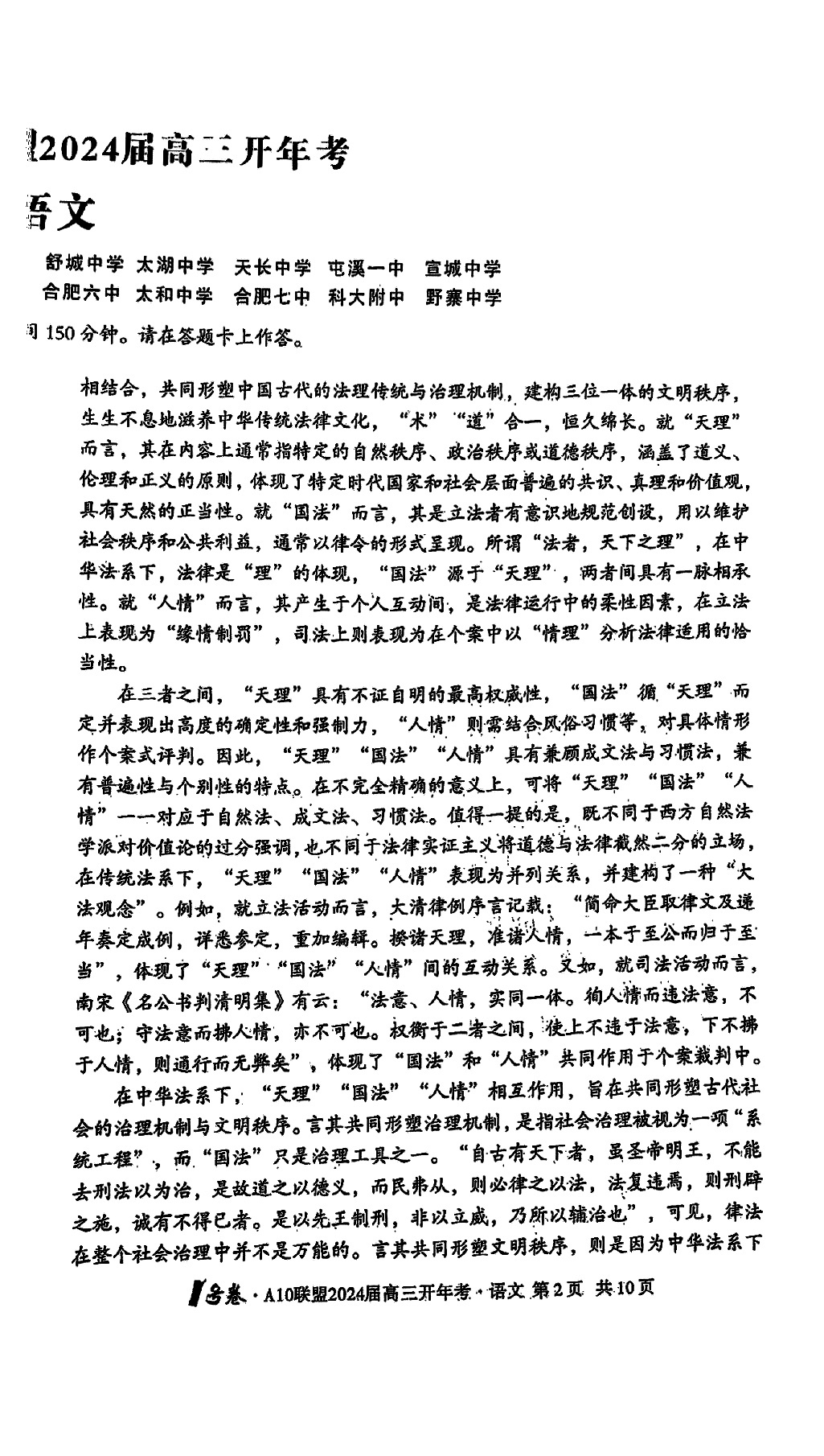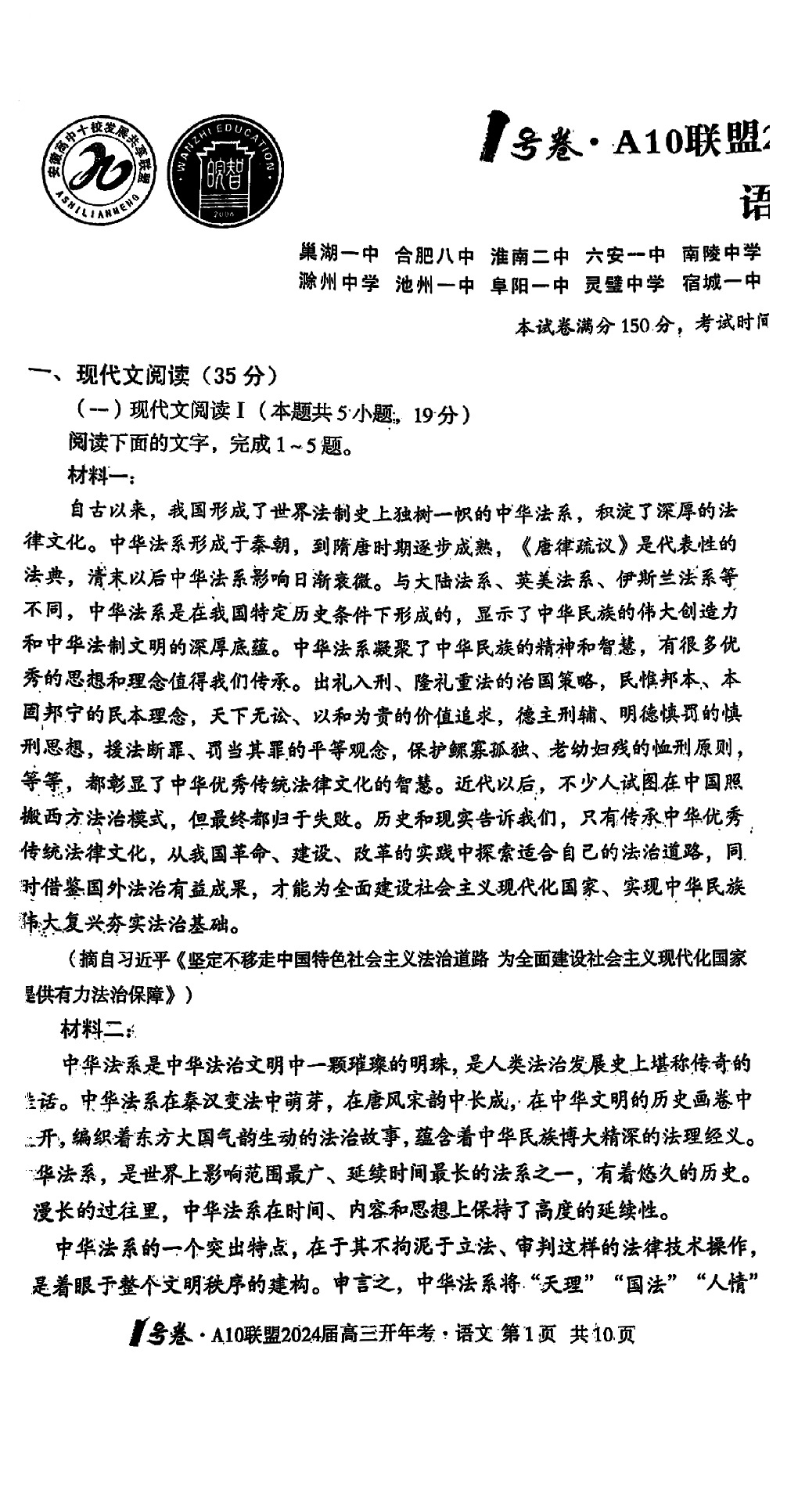 以下为2024届安徽A10联盟高三开年考各科答案及试卷汇总: